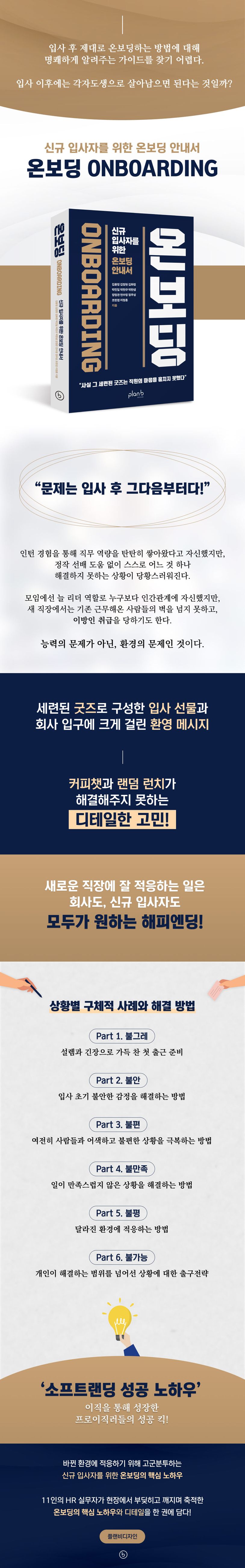 신규 입사나 이직하여 새로운 직장 생활을 시작하는 사람들은 모두 적응의 기간이 필요하다. 취업에 성공한 순간은 해피하겠지만, 실제 직장 생활에서 겪게 되는 고민은 해피하지 않을 수 있다. HR 현장에서 직접 채용과 교육을 담당하는 11명의 저자가 입사 후 제대로 된 온보딩에 대해 구체적이고 실제 도움이 되는 방법을 사례를 통해 알려주고 있다. 입사 초기 막연함, 불안함, 새로운 인간관계의 불편함, 업무방식이나 조직문화가 낯설어도 모두의 마음속에는 ‘일 잘하는 사람으로 성장하고 싶다’고 생각할 것이다. 이전 직장에서 직무 역량을 탄탄히 쌓았다고 자신하며 이직했지만, 현실의 직장 생활은 다를 수 있다. 게다가 새로운 동료들과의 벽이 느껴진다면, ‘이 회사에 잘 적응할 수 있을까’라는 고민에 빠지게 된다. 하지만 문제는 능력이 아닌 환경이다. 환경이 달라지면 대응도 달라져야 한다. 이 책은 6개의 테마로 상황별 구체적인 사례와 함께 해결 방법을 제안한다. 첫 출근, 입사 초기 불안함, 사람들과의 어색하고 불편한 상황, 달라진 환경 등에 적응하고 극복하는 방법을 현장감 있게 알려준다. 새로운 환경에 적응하기 위해 고군분투하는 신규 입사자들을 위해 이 책은 조직에 빠르게 적응하고 성공적으로 자리매김하는 데 도움이 되는 안내서가 될 것이다.