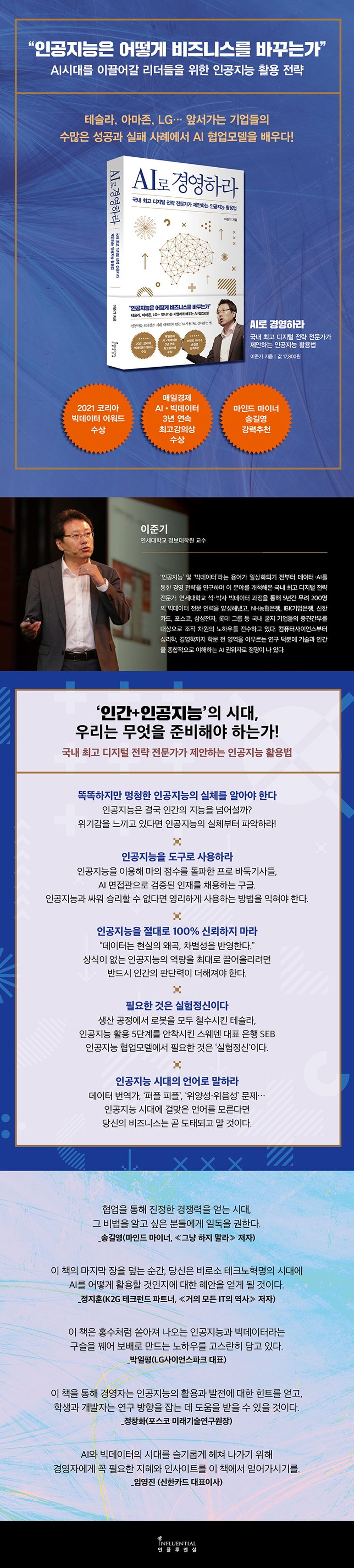 그는 이 책 ≪AI로 경영하라≫에서 2020년 이후의 빅데이터 및 인공지능의 현황과 이것을 올바로 이해하는 법, AI를 어떻게 활용해야 하는지에 관한 실용적 지침을 가감 없이 풀어냈다. 특히 국내외 굴지 기업들이 인공지능을 도입하며 겪은 실패 및 성공 사례를 조목조목 담아내, 인공지능과의 이상적인 협업에 대한 이상적인 롤모델을 제시하고 있다. 남보다 한발 앞서 새로운 경영 프로세스를 구축하고 싶은 경영자, 좀 더 합리적인 의사결정을 하고 싶은 실무자, 나아가 인공지능의 시대에 걸맞은 경쟁력을 갖추고 싶은 모든 이들에게 의미 있는 텍스트가 될 것이다.