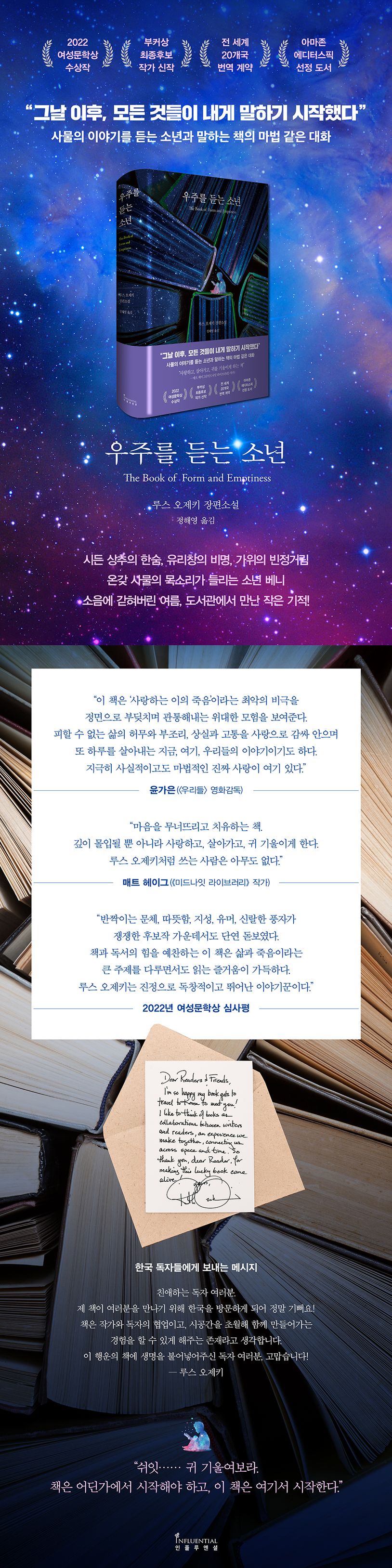 전작 《내가 너를 구할 수 있을까》로 부커상 최종 후보에 올랐던 루스 오제키의 신작 장편소설 《우주를 듣는 소년》은 아버지의 죽음 후 온갖 물건들의 목소리를 듣게 된 열네 살 소년 베니와 저장강박증을 겪는 엄마 애너벨의 이야기로, 가슴 아픈 상실 이후의 치유와 회복의 과정을 담아낸다. ‘소년’과 ‘책’의 교차 서술로 이루어진 독특한 형식을 통해 예민한 사춘기 소년의 성장 스토리를 섬세하고도 흥미진진하게 그려내는 한편, 현대 소비문화와 기후변화, 사회적 고립, 정신 질환과 마약 문제 등 복잡다단한 사회 문제를 다루고 있다.