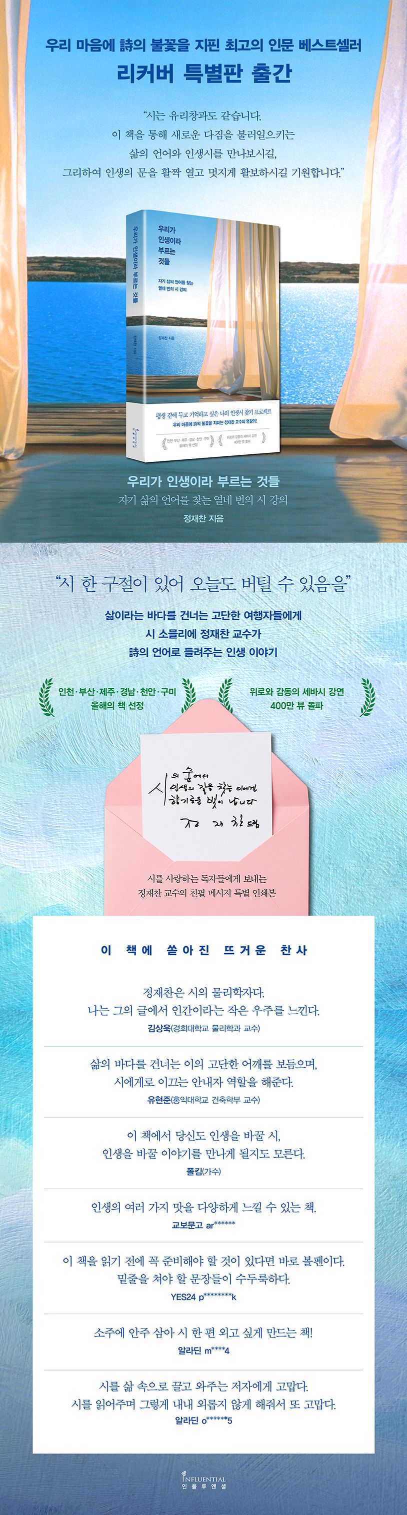 시(詩)가 유리창과 같다면, 시 이야기를 징검다리 삼아 조망하는 인생의 다채로운 풍경은 그림 속 윤슬처럼 반짝이고 있지 않을까. 유리창 안팎을 넘나드는 산들바람이 신선한 공기를 환기하듯이, 시라는 유리창을 통해 우리 삶에도 새로운 활기를 불어넣고자 하는 이 책의 메시지를 표지 디자인으로 형상화했다. 정재찬 교수의 친필 메시지가 인쇄된 이번 리커버 특별판이 독자들에게도 좋은 선물이 될 것이다.
