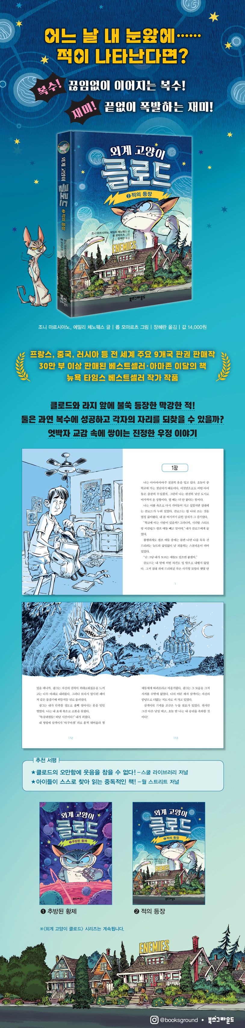 어린이들의 입소문을 타고 출간 즉시 베스트셀러가 된 화제작 〈외계 고양이 클로드〉 시리즈가 두 번째 이야기로 돌아왔다. 1권에서 외계에서 지구로 추방된 고양이 황제 클로드와 작은 마을 엘바로 이사 온 라지의 웃음 터지는 낯선 세계 적응기가 펼쳐졌다면, 2권에서는 클로드와 라지 앞에 ‘적’들이 기습적으로 등장하며 명예와 자존심을 건 흥미진진한 복수극이 펼쳐진다. 복수에 불타 무아지경이 된 클로드의 모습은 폭소를 자아낼 뿐 아니라 짜릿함을 선사한다. 곳곳에 숨겨진 웃음 폭탄은 한 번 터지면 멈출 수 없으니 기대하시길!