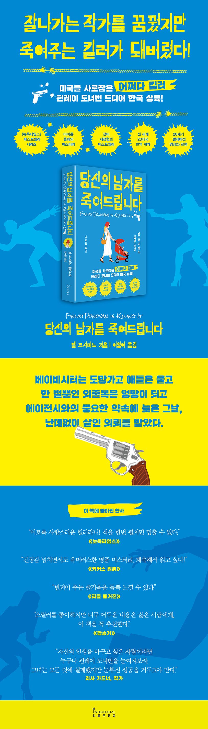 ‘어쩌다’ 프로 킬러로 오인받은 로맨스 스릴러 작가 핀레이가 ‘어쩌다’ 임무를 성공한다면? 일과 가정 모두가 엉망진창인 채로 시작한 월요일 아침, 누군가 죽이고 싶을 정도로 울분이 쌓인 엄마 핀레이가 겪는 평범할 듯 평범하지 않은 이 소동은 미국 독자들의 취향을 정확히 저격했다. 독자들은 공감하고 응원을 보내며 북클럽을 열어 함께 읽기도 했다. “한번 읽기 시작하면 끝낼 때까지 손에서 놓을 수 없는, 미친 책!”이라는 다소 과격한 호평과 함께 이어진 ‘독서 인증 릴레이’는 어떤 광고보다 강력하게 성공을 견인했다. 생생하게 살아 있으면서도 매력 넘치는 인물들의 상호작용과 무서운 흡인력은 이 작가의 인기가 일시적인 운이 아님을 증명하며 연이은 후속작으로 이어졌다. 후속작이 출간되면서 판매량이 떨어진다는 출판계의 법칙을 깨고 시리즈 역시 연일 도약 중이다. 《당신의 남자를 죽여드립니다》는 아마존 올해의 미스터리, 전미서점협회 베스트셀러 선정과 함께 전 세계 20개국에 번역 계약되었으며, 20세기 텔레비전(구 20세기 폭스 텔레비전)에서 영상화를 진행 중이다.