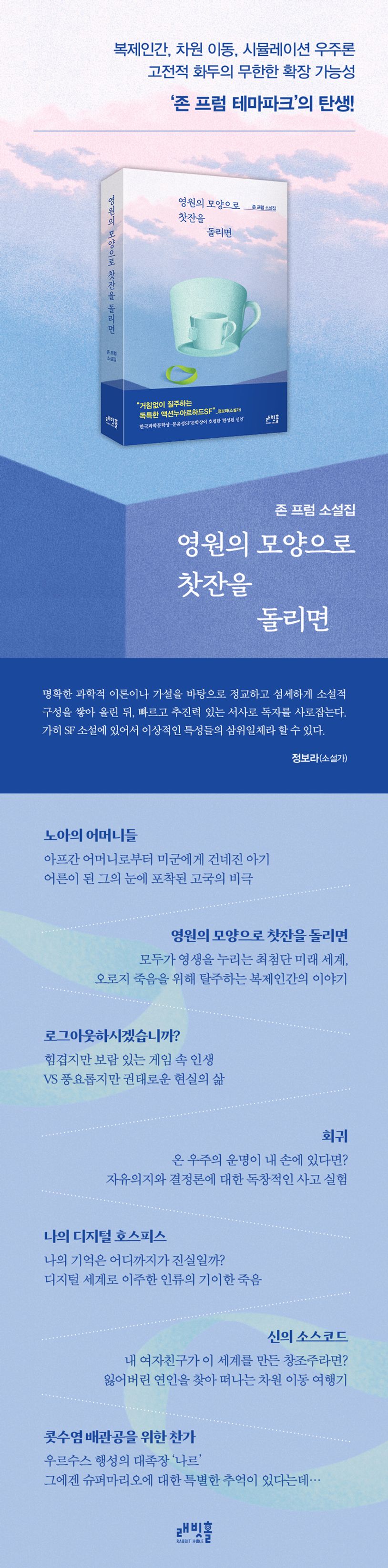 존 프럼은 2019년 “아이디어를 극한까지 밀어붙인다”(김보영)는 평을 받으며 〈영원의 모양으로 찻잔을 돌리면〉(발표 당시 〈테세우스의 배〉)으로 한국과학문학상 우수상을 수상하며 데뷔했다. 2022년에는 “한눈팔지 않고 다음 이야기를 읽게 만드는 힘이 있다”(김초엽)는 평을 받으며 문윤성SF문학상 가작을 수상하며 문단의 주목받는 신예로 떠올랐다. 개인 정보를 공개하지 않고 활동하는 작가는 고전 SF의 여러 가지 화두를 능수능란하게 다루면서도 자신만의 독창적인 작품 세계를 선보인다. 인간과 세계에 대한 진중한 질문을 던지면서도 위트 넘치는 7편의 단편소설이 묶였다.