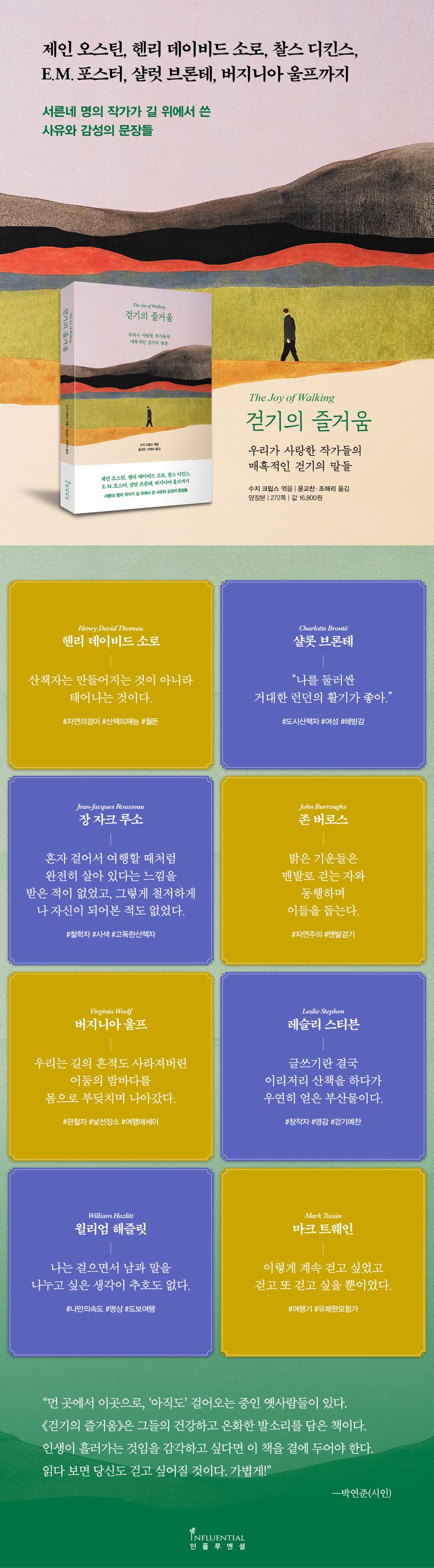 유튜브와 SNS, 숏폼이 지배하는 세상, 영화나 드라마마저 ‘10분 요약’으로 즐길 만큼 숨가쁘게 돌아가는 가운데서도 걷기 인구는 오히려 늘고 있다. 바쁜 일상에서 걷는 행위를 열망하게 되는 이유는 무엇일까. 두 발을 번갈아 내딛는 단순한 행위이자, 수단이자 목적 그 자체인 ‘걷기’는 인간의 역사를 통틀어 철학과 예술에 자극제가 되어왔다. 그리고 현대인들에게는 가장 손쉬운 명상법이자 치유법이기도 하다. 위대한 작가, 예술가, 철학자 대다수가 열정적인 산책자였으며 그들에게 걷기가 주요한 영감이자 소재가 되어온 사실은 그리 놀랍지 않다. 니체는 "진정 위대한 모든 생각은 걷기에서 나온다"고 말했으며, 《월든》의 저자이며 미국을 대표하는 작가이자 사상가 소로에게도 걷기란 하루도 거르지 않고 행한 종교적 행위나 다름없었다. 영국을 대표하는 시인 워즈워스는 일평생 28만 킬로미터를 걸었다고 하며 이는 지구를 일곱 바퀴 돈 셈이다. 버지니아 울프의 아버지이자 문학자 레슬리 스티븐은 "나의 하루하루는 걷기에 대한 열망으로 얽혀 있다"며, "글쓰기란 결국 산책의 부산물"이라고 고백한다.