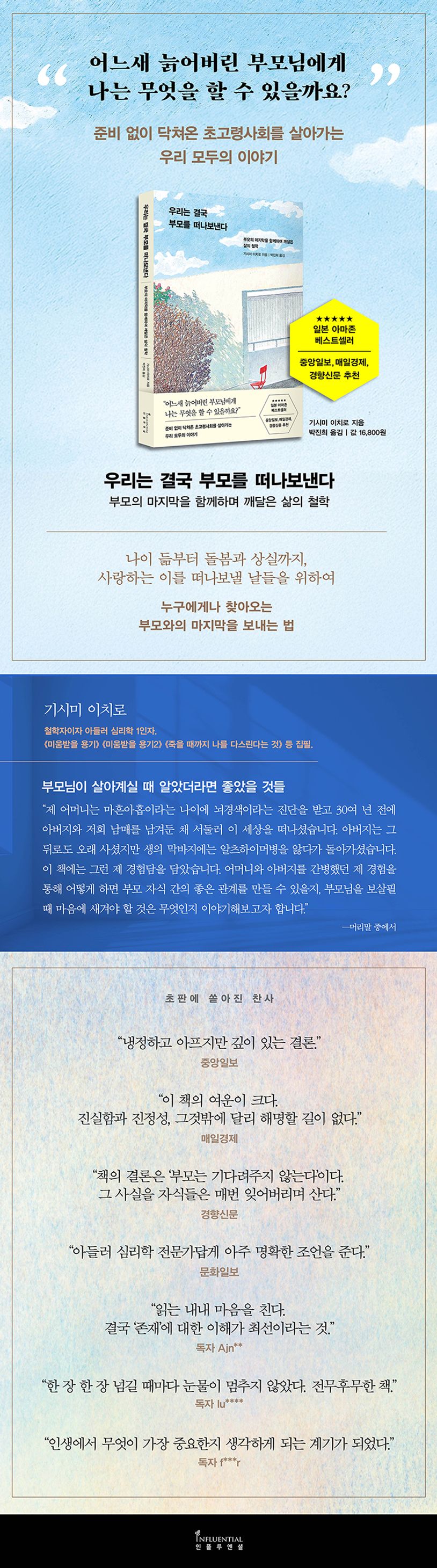 《미움받을 용기》로 한국 사회에 아들러 열풍을 일으킨 기시미 이치로가 20대에 뇌경색으로 쓰러진 어머니를 간병하고, 50대에 치매에 걸린 아버지를 오랜 시간 돌봐온 자신의 실제 경험을 담은 《우리는 결국 부모를 떠나보낸다》가 출간되었다. 부모의 마지막 순간을 함께한 철학자이자 심리학자로서, 저자는 이 책에서 부모를 돌보며 마주한 감정과 일상의 문제, 죽음을 대하는 태도를 냉정하고도 유쾌하게 풀어냈다. 특히 그 길을 먼저 걸어간 자로서 겪은 시행착오들을 가감 없이 전해, 실제 일상에서 나이 든 부모와 어떻게 좋은 삶을 살아갈지에 대한 구체적인 답을 제시해준다.