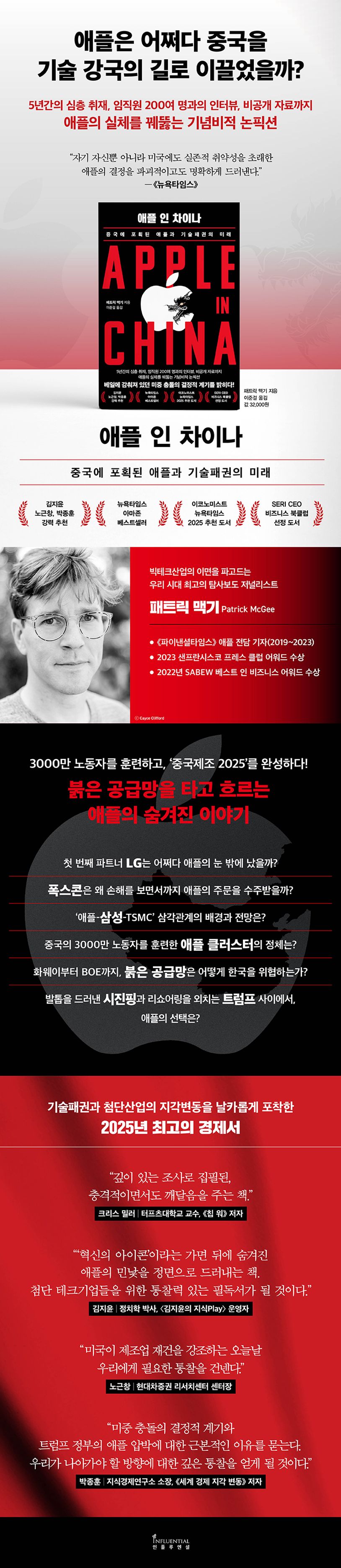 《파이낸셜타임스》의 애플 전담 기자 패트릭 맥기는 애플이 미중 충돌의 방아쇠를 당겼다고 폭로한다. 2019년부터 5년여간 세계 최고 기업의 이면을 파헤친 그는 《애플 인 차이나》에서 상상 이상의 거대한 이야기를 전한다. 바로 혁신의 아이콘 애플이 권위주의 국가 중국에 ‘포획’되었다는 것이다. 애플은 어쩌다 제품 생산의 90퍼센트 이상을 의존할 만큼 중국에 얽매이게 되었을까? 중국은 이로써 무엇을 얻었고, 다음으로 무엇을 노릴까? 미국은 이 상황을 과연 되돌릴 수 있을까? 일련의 사태가 세계경제에, 또 삼성과 LG 등 애플의 협력사이자 경쟁사를 보유한 한국에 미칠 파장은 무엇일까? 책은 애플의 운명을 가를 이 물음들에 답을 찾아가며, 글로벌 빅테크산업과 기술패권의 지각변동을 날카롭게 포착한다. 두 강대국의 충돌과 공급망의 분열이 얽히고설키며 불확실성이 심화하는 오늘날, 애플의 행보를 되짚어본 이 책은 기업 경영자, 정책 결정자, 개인 투자자 모두에게 깊은 통찰을 건넬 것이다.