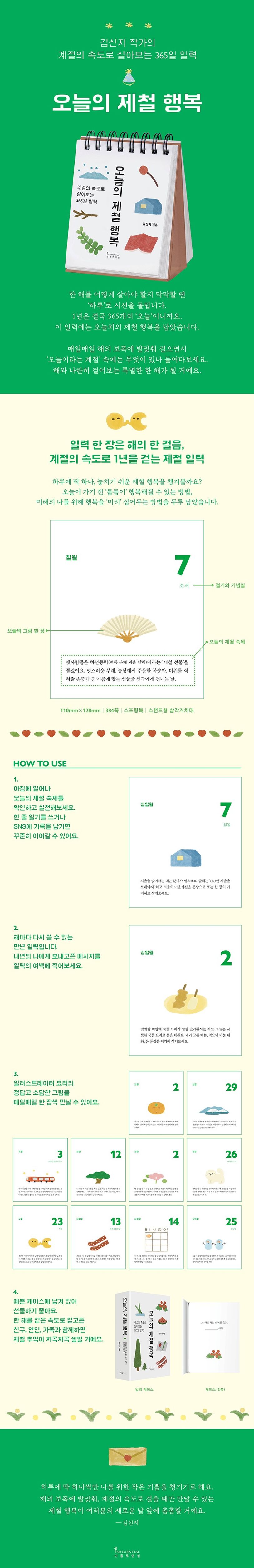 《오늘의 제철 행복》은 뜯지 않고 해마다 사용할 수 있는 만년 일력으로, 매년 이맘때 반복하고픈 나만의 연례행사를 만들어볼 수 있어요. 일러스트레이터 요리 작가가 그린 오늘의 그림 한 컷도 하루의 작고 귀여운 선물이 되어줍니다. 일력과 함께 계절의 속도로 걸으며 하루에 딱 하나씩, 오늘치의 제철 행복을 챙길 수 있다면 우리의 한 해는 더욱 촘촘한 기쁨으로 채워질 거예요.