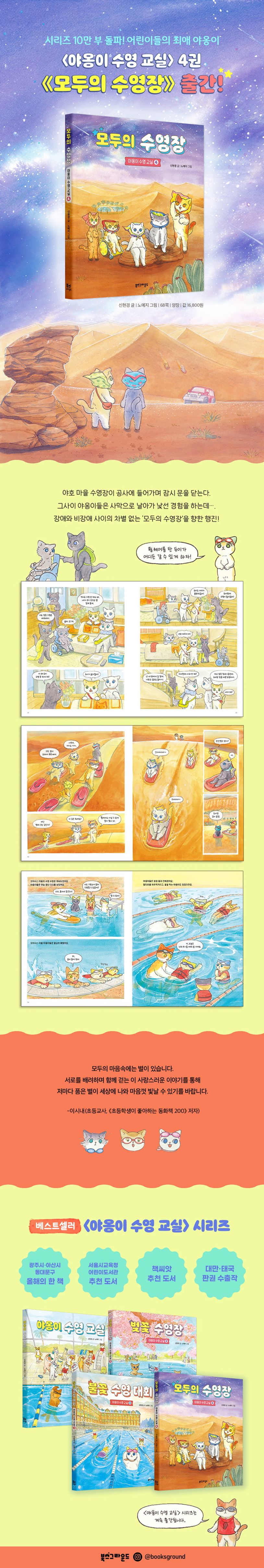 꾸준한 사랑을 받으며 10만 부를 돌파한 어린이들의 최애 시리즈 〈야옹이 수영 교실〉이 4권으로 돌아왔다. 이번 권에서 야호 마을의 수영장은 잠시 문을 닫는다. 장애가 있는 고양이도 수영이 가능한 ‘모두의 수영장’으로 거듭나기 위해서 시설 공사에 돌입한 것이다. 그동안 야호 마을 야옹이들과 프릴은 비행기를 타고 사막 속 ‘오아시스 마을’에 머문다. 그곳에서 지내며 휠체어를 탄 디디가 모래 썰매를 즐기고, 버스를 타고 별을 보러 가고, 자연스럽게 수영까지 배우는 모습을 목격한다. 사막에서의 경험으로 야옹이들은 모두가 자유롭게 어우러져 살아가는 사회가 어떻게 가능한지를 생각한다.