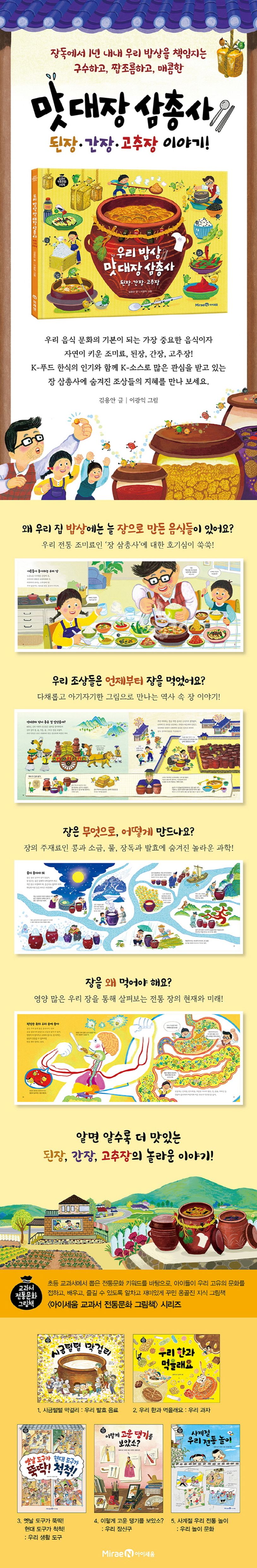 최근에는 K-푸드인 한식의 인기가 높아지면서 K-소스로 불리는 한국의 된장과 간장, 고추장에도 많은 관심이 쏟아지고 있어요. 이 책은 전 세계인들의 사랑을 받기 시작한 우리 밥상 맛 지킴이 삼총사 ‘된장, 간장, 고추장’에 담긴 놀라운 이야기를 포근한 글과 다채로운 그림으로 들려주는 지식 그림책이에요. 전통 장에 관한 이야기를 글과 그림으로 생생히 즐기고, 장 속에 숨겨진 조상들의 지혜를 자연스럽게 배울 수 있도록 이끌었지요. 책 속 아빠와 아이들의 모습을 따라 우리 전통 장의 가치와 중요성을 깨닫고, 장으로 만든 밥상 위 음식들을 더 맛있고 건강하게 즐겨 보아요!