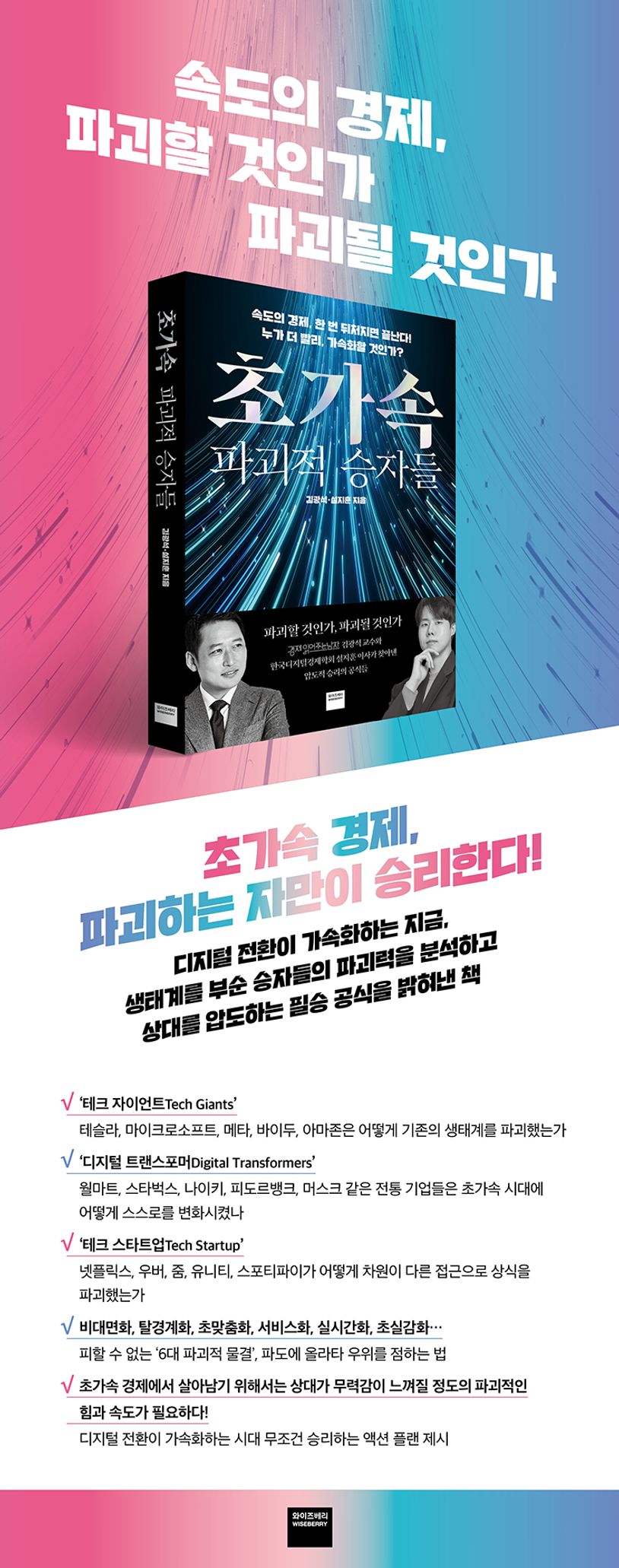 한 번 뒤처지면 끝나는 초가속의 시대. ‘경제 읽어주는 남자’ 김광석 교수와 한국디지털경제학회 설지훈 이사가 초가속 시대에 압도적 승리를 거머쥐는 법을 이 책 《초가속 파괴적 승자들》에서 밝혀냈다. 디지털 경제 전문가인 두 저자는 이 책을 통해 디지털 전환이 가속화하는 지금 그 흐름을 이해하고, 어떻게 대응해야 할지를 제시한다.