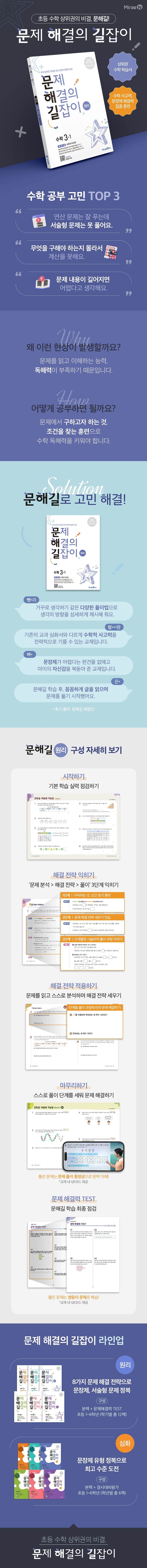 - 하루아침에 수학 실력이 껑충 뛰어오르지 않는 건 왜일까요? 문제집을 두세 권씩 풀어도 수학 실력이 눈부시게 향상하지는 않아 속상하셨죠? 어려운 문제를 만나면 여지없이 틀리기 때문에 점수가 오르지 않는 것입니다. 문·해·길은 문장제 유형을 정복함으로써 고난도 문제를 해결하는 자신감을 키웁니다.