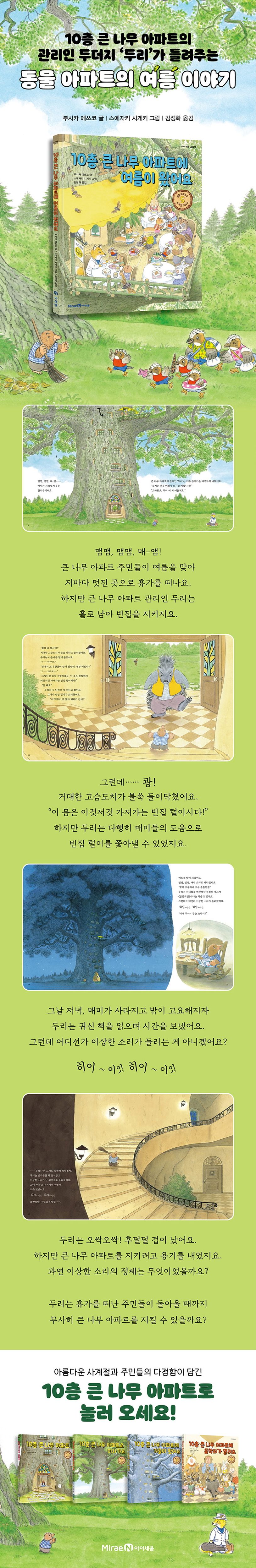 10층 큰 나무 아파트에 여름이 찾아왔어요! 아파트에 사는 동물 주민들은 저마다 멋진 계획을 세워 여름휴가를 떠나지요. 하지만 아파트 관리인인 두리는 큰 나무 아파트에 홀로 남아 빈집을 지키기로 해요. 그런데 한낮에는 큰 나무 아파트가 텅 빈 걸 알아챈 거대한 고슴도치가 느닷없이 들이닥치고, 한밤에는 어디선가 “히이~이잇 히이~이잇!” 하는 이상한 귀신 소리가 들려와요. 과연 두리는 이 커다란 10층 큰 나무 아파트에서 홀로 잘 버틸 수 있을까요?