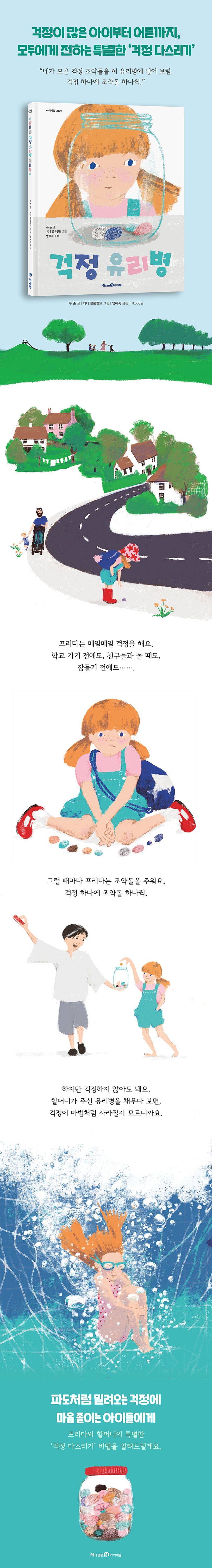 그림책 《걱정 유리병》은 걱정이 많은 아이, 프리다가 할머니가 건넨 유리병을 통해 스스로 자신의 걱정을 다스리게 되는 놀라운 성장 과정을 혼혼히 그려냈습니다. 이 그림책은 걱정으로 물든 어린이 독자는 물론 성인 독자의 마음마저 찬찬히 밝히며 따뜻한 위로와 격려를 전해줄 것입니다.