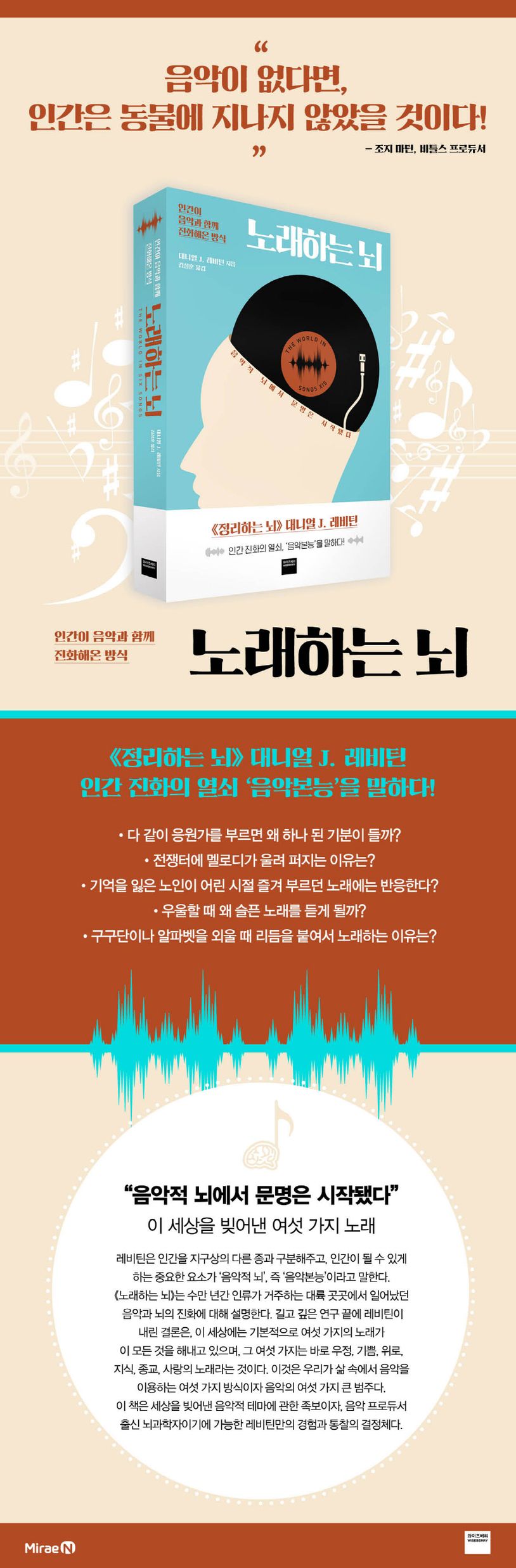 《노래하는 뇌》는 음악 프로듀서 출신 뇌과학자이기에 가능한 레비틴만의 경험과 연구의 결정체다. 그의 인생이 담긴 이 책에서 밝히는 음악과 인류 공통 역사를 이해하면 음악이 어떻게 진화의 원동력으로 작용했는지, 그리고 음악이 어떻게 인간 본성의 발달을 안내하는 길잡이 역할을 했는지에 대해 색다른 깨달음을 얻게 될 것이다.