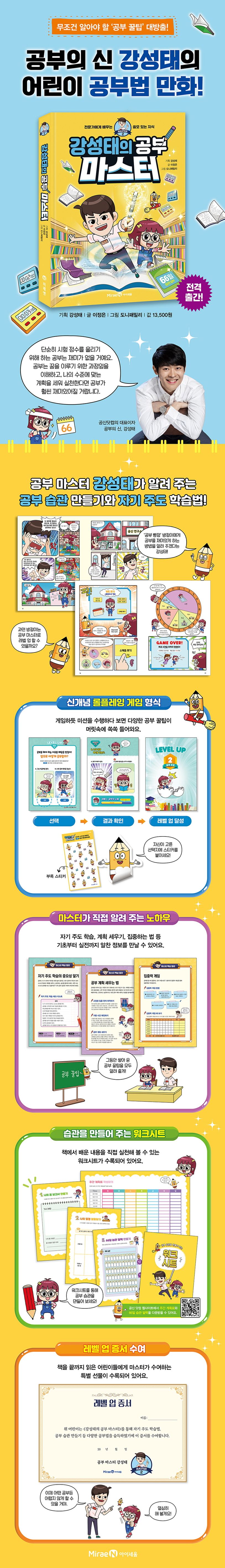 공부, 왜 해야 할까요? 지금도 많은 학생들이 시험 점수를 올리기 위해 억지로 책상 위에 앉아 있을 것입니다. 그러나 단순히 시험 점수를 올리기 위해서 하는 공부는 결코 쉽지 않습니다. 공부를 재미있게 하려면, 공부가 내가 바라는 꿈을 이루기 위한 과정임을 이해하고, 그에 따른 공부 계획을 나의 수준에 맞게 체계적으로 세워야 합니다. 대한민국 수험생들의 공부 멘토이자, ‘공부의 신’이라는 별명으로도 유명한 강성태는 대한민국의 모든 학생들이 공부를 신나게 할 수 있게 되기를 꿈꾸며 오랜 시간 다양한 공부법을 연구해 왔습니다. 《강성태의 공부 마스터》에서는 공부법 전문가 강성태가 ‘공부 마스터’로 등장하여, 그동안 쌓아 온 다양한 공부 노하우를 어린이들에게 전달합니다.