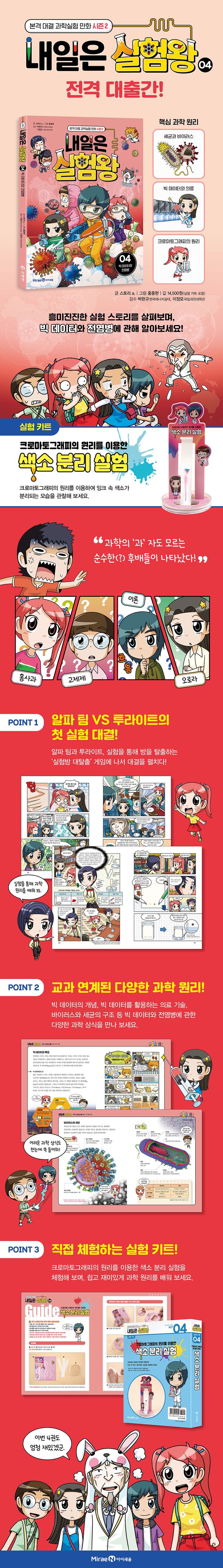 개성 만점 주인공들이 펼치는 박진감 넘치는 실험 대결 만화로 꾸준히 사랑받아 온 《내일은 실험왕》 시리즈가 시즌 2로 돌아왔습니다. 시즌 2에서는 초·중등 교과서에 수록된 과학 원리는 물론, 4차 산업 혁명의 시대를 이끌어 갈 어린이들이 꼭 알아야 할 미래 과학 상식을 만화와 정보 페이지로 풀어 냈습니다. 생생한 만화를 통해 미래 과학 기술이 실생활에서 어떻게 활용되는지 살펴보고, 과학 기술의 발전이 우리의 미래를 어떻게 바꾸어 놓을지 상상하며 미래 과학에 대한 흥미와 탐구심을 높여 보세요. 또 책 속의 과학 실험을 내 손으로 직접 체험할 수 있는 실험 키트 활동을 통해 체험을 통한 높은 학습 성과를 누려 보세요.
