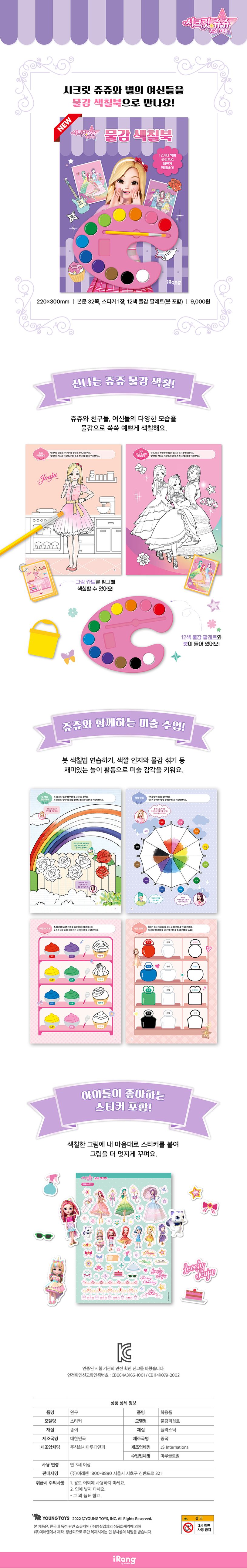 쥬쥬, 신디, 스텔라와 별의 여신들을 물감으로 색칠하며 놀아요. 안전 인증을 통과한 12색 물감 팔레트로 쥬쥬, 신디, 스텔라 세 친구들의 일상과 변신한 모습, 별이 여신들의 인간 세계에서의 모습과 본 모습까지 다채롭게 색칠해 보세요.