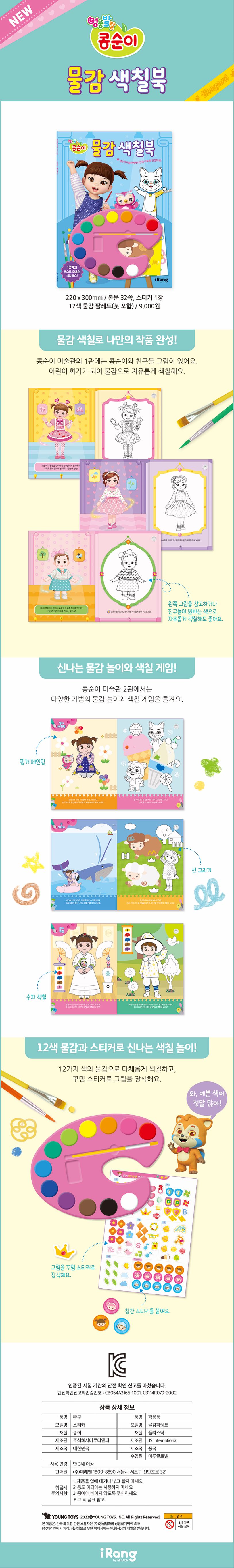 콩순이 미술관으로 친구들을 초대합니다! 친구들이 멋진 화가가 되어 콩순이 미술관에 전시할 작품들을 완성해 주세요. 안전 인증을 통과한 12색 물감 팔레트로 콩순이와 송이, 밤이, 미캣, 래쿤, 콩콩이 등 다양한 친구들의 그림을 색칠해 보세요. 어떤 색으로 색칠할지 고민되면 왼쪽 페이지의 그림을 참고할 수도 있어요.