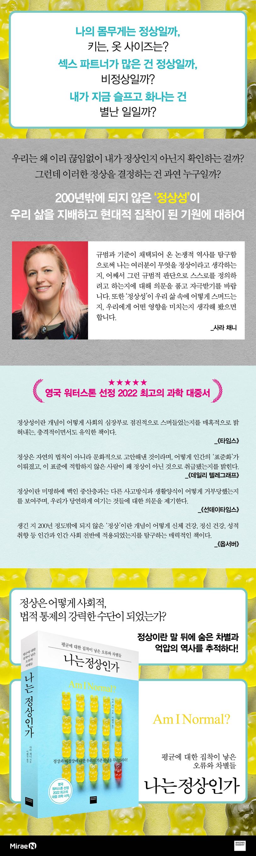 그럼에도 우리는 왜 이리 정상, 비정상을 나누고 정상에 집착하는 걸까? 정상과 비정상은 대체 누가 결정하는 걸까? 영국의 정신 건강 연구가 사라 채니는 수학에서 비롯된 ‘정규분포’가 어떻게 사회적·문화적 맥락으로서의 ‘정상’이 되었는지 그 흐름을 추적하고, 그 과정에서 정상이란 개념이 어떻게 고착화되었는지를 탐구한다.