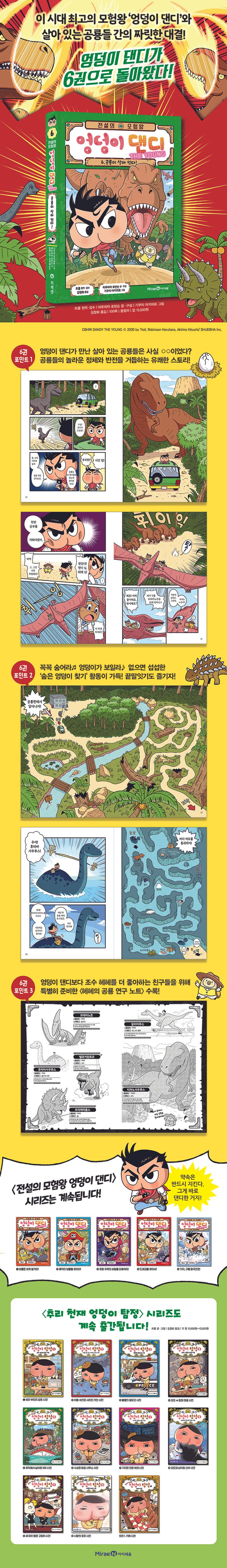 첫 번째 이야기 「공룡이 살아 있다!」 편에서는 스필 섬의 공룡 연구소로 찾아간 엉덩이 댄디와 헤헤가 누군가 난동을 부린 것 같은 텅 빈 곳에서 날카로운 발톱과 이빨을 가진 벨로키랍토르와 최강의 육식 공룡 티라노사우루스와 맞닥뜨리는 이야기를, 두 번째 이야기 「가자, 꼬리 산으로!」 편에서는 티라노사우루스에게 둘러싸인 엉덩이 댄디와 헤헤가 줄리 박사의 조수 라시크를 만나 두 사람이 수행하던 연구의 전말을 알게 되고, 최강의 육식 공룡인 티라노사우루스를 상대로 한 치의 물러섬 없는 치열한 대결을 펼치는 내용이 담겨 있습니다. 이어지는 세 번째 이야기 「헤헤의 소원」 편에서는 스필 섬에 평화를 가져다 준 엉덩이 댄디와 헤헤가 스필 섬에 온 본래 목적이었던 ‘보물 회수’를 위해 바닷물에 잠긴 길도 통과해 가며 무사히 보물을 회수하는 짜릿한 모험이, 네 번째 이야기 「엉망진창 연구실」 편은 엉덩이 댄디와 헤헤가 바다너머 박물관에 갓 입사했을 무렵, 정리 정돈과 관련된 잊을 수 없는 추억이 펼쳐집니다. 멸종된 것으로 알려진 다양한 초식·육식 공룡들과 벌이는 짜릿한 한판 모험! 신간 《전설의 모험왕 엉덩이 댄디 6》에서 책 속 공룡들의 놀라운 정체도 확인하고, 흥미진진한 모험도 즐겨 보세요.