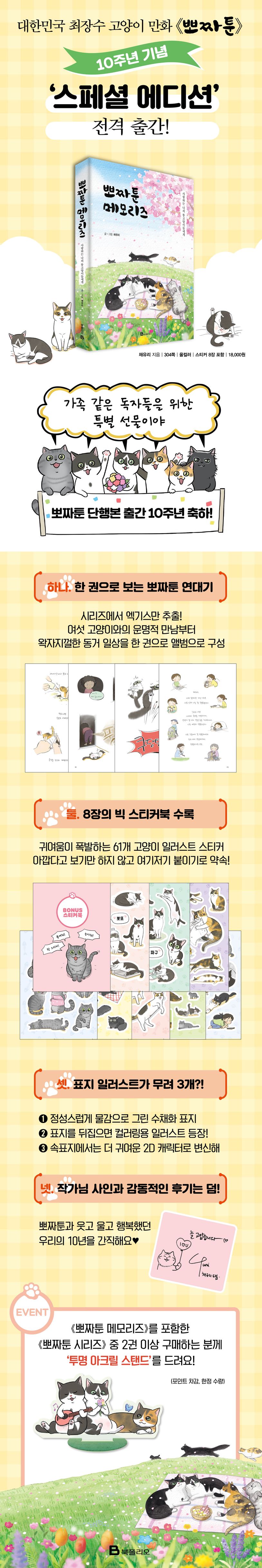 수많은 애묘인 독자들의 마음을 두드린 세상 특별한 고양이 만화 《뽀짜툰》의 단행본 출간 10주년 기념 스페셜 에디션, 《뽀짜툰 메모리즈》가 북폴리오에서 출간됐다. 작가의 첫째 고양이 뽀또와 짜구를 입양하게 된 운명의 그날부터 연이어 만나게 된 쪼꼬, 포비, 봉구, 꽁지와의 특별한 일화, 그렇게 고양이 가족이 되어 함께 웃고, 행복하게 고군분투하며 지내다가… 안타까운 이별을 하기까지의 이야기를 그린 대한민국 최장수 고양이 만화가 바로 《뽀짜툰》이다. 《뽀짜툰 메모리즈》는 20년이 넘는 이 고양이 가족의 동고동락 연대기를 앨범 형식으로 압축한 특별판이다.