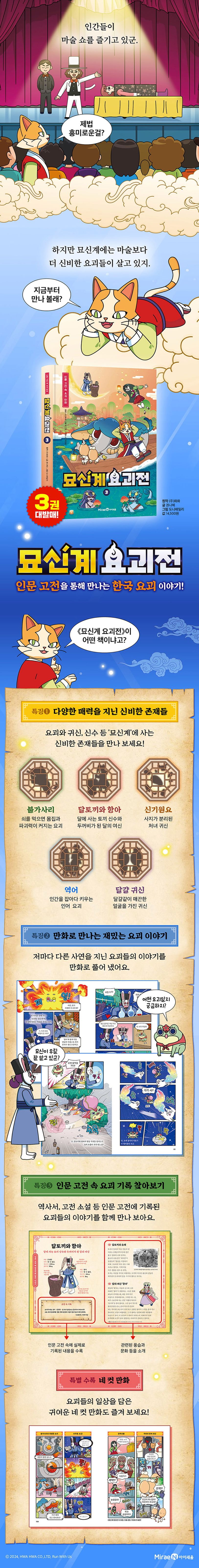 《묘신계 요괴전》은 《자산어보》, 《송남잡지》 등 옛 문헌에 기록된 내용은 물론이고, 〈토별가〉, 〈달걀귀신 설화〉 등 구전으로 전해 내려오는 이야기까지 다양한 인문 고전을 바탕으로 구성한 ‘인문 고전 속 요괴 만화 시리즈’입니다. 묘신계에 살고 있는 요괴들을 재미있는 만화로 만나고, 이 요괴들이 인문 고전 속에 어떤 모습으로 등장하는지, 또 이와 관련된 역사와 문화 등 인문학적 지식까지 함께 살펴보세요. 묘신계만의 흥미로운 설정이 더해진 요괴 이야기에 빠져들어 책을 읽다 보면 어느새 인문학적 소양도 쑥쑥 자라 있을 것입니다.