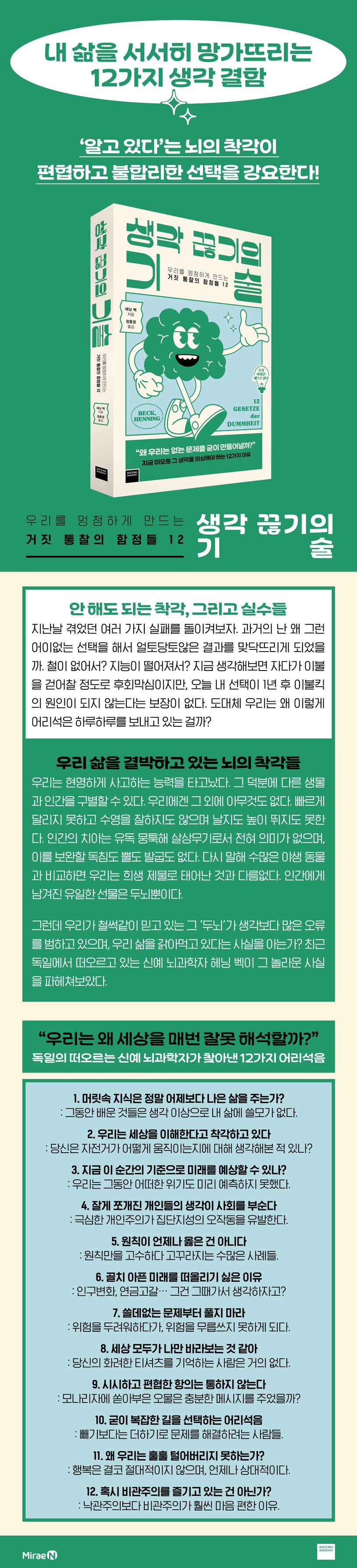 바로 12가지 사고 오류 때문이다. 이 오류들은 알게 모르게 우리를 고정된 생각의 틀에 갇히게 해 올바른 판단과 합리적 의사결정을 막는다. 때문에 우리는 어리석은 결정과 행동을 반복한다. 이러한 잘못된 연결 고리를 끊어낼 방법은 없을까? 독일에서 손꼽히는 뇌과학자 헤닝 벡은 우리가 쉽게 빠지는 12가지 사고 회로를 찾아냈다. 그는 이러한 반복적인 생각의 틀을 깨야 두뇌의 합리적 판단을 최대한 끌어내며 더 나은 미래를 맞이할 수 있다고 주장한다.