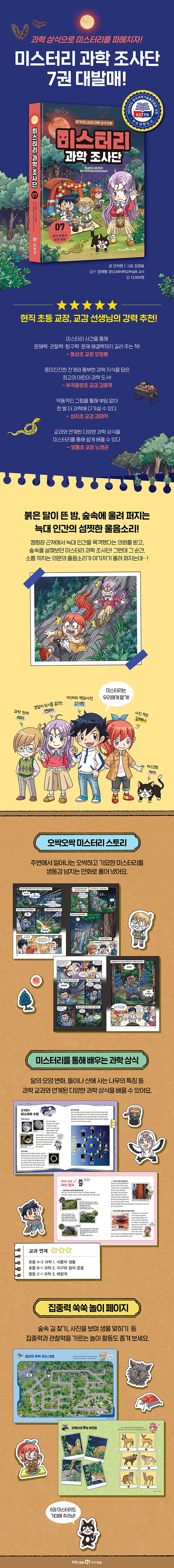 책 속으로 빨려 들어가는 오싹하고 신기한 미스터리 스토리를 생동감 넘치는 만화로 풀어 냈습니다. 또한 만화 중간중간에 수록된 정보 페이지는 ‘들이나 산에 사는 나무의 특징’, ‘달의 모양 변화’와 ‘일식과 월식’ 등 초등학교 4학년 2학기 과학 1. 식물의 생활, 중학교 2학년 1학기 과학 3. 태양계 등에서 다루는 핵심 내용을 담고 있지요. 어렵게만 느껴졌던 과학 상식을 미스터리를 더한 흥미로운 이야기를 통해 즐겁게 배워 보세요!