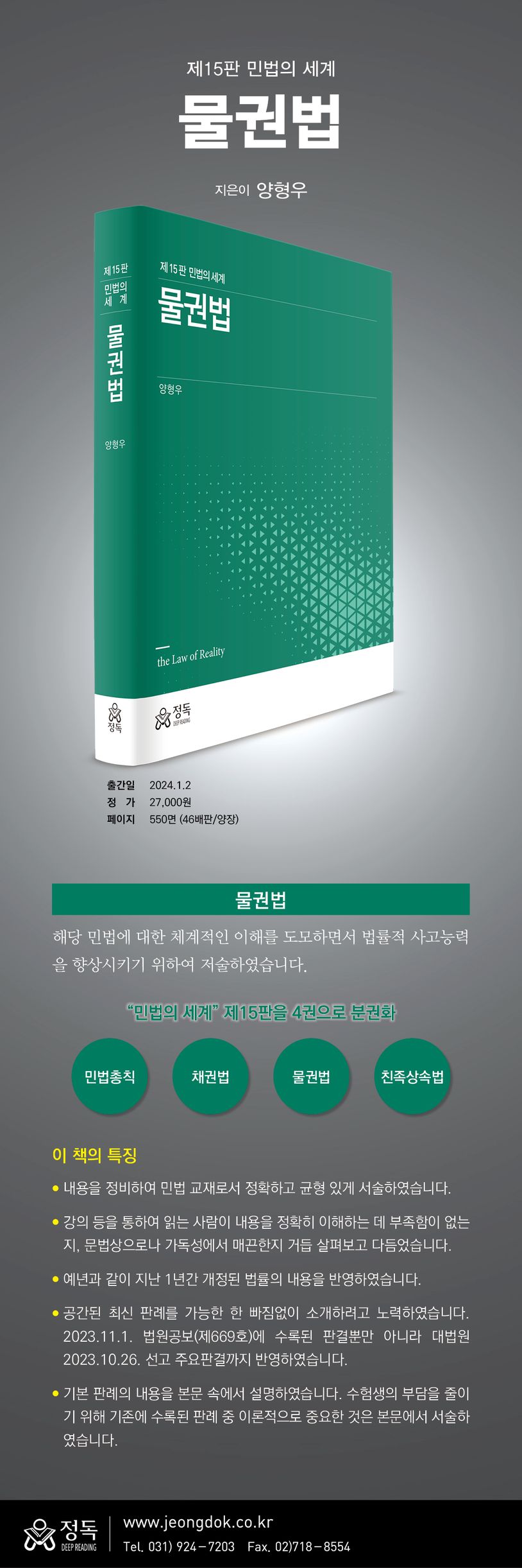 첫째, 내용을 정비하여 민법 교재로서 정확하고 균형 있게 서술하였다. 민법의 기본법리에 대한 정확한 이해를 위하여 필요한 범위 내에서 충분한 설명이 불가피하여 28곳 이상 내용을 수정・보완하였고, 그 결과 제14판에 비해 22면 상당의 분량이 늘어났다. 내용을 전면 개고한 부분은 무효등기의 유용, 관공서의 등기촉탁, 가등기 이후 등기의 직권말소, 가등기의 말소, 전세권의 담보제공, 전세권의 존속기간 만료, 유치권과 압류등기 효력의 관계, 유치권자의 경매권과 우선변제권이다. 또한 내용을 수정・보완한 부분을 밝히면, 공용징수, 변경등기, 등기의 추정력, 점유매개관계, 점유물반환청구권, 점유취득시효, 소유물방해제거청구권, 관습상 법정지상권, 분묘기지권, 유치권에 특유한 소멸사유, 채권질권의 효력, 저당권설정계약, 저당권과 조세채권과의 관계, 저당권실행의 효과, 저당부동산의 제3취득자의 변제, 후순위저당권자의 대위권과 물상보증인의 대위권의 관계, 근저당권의 변경, 지상권・전세권을 목적으로 하는 저당권, 가등기담보, 양도담보 등이다.