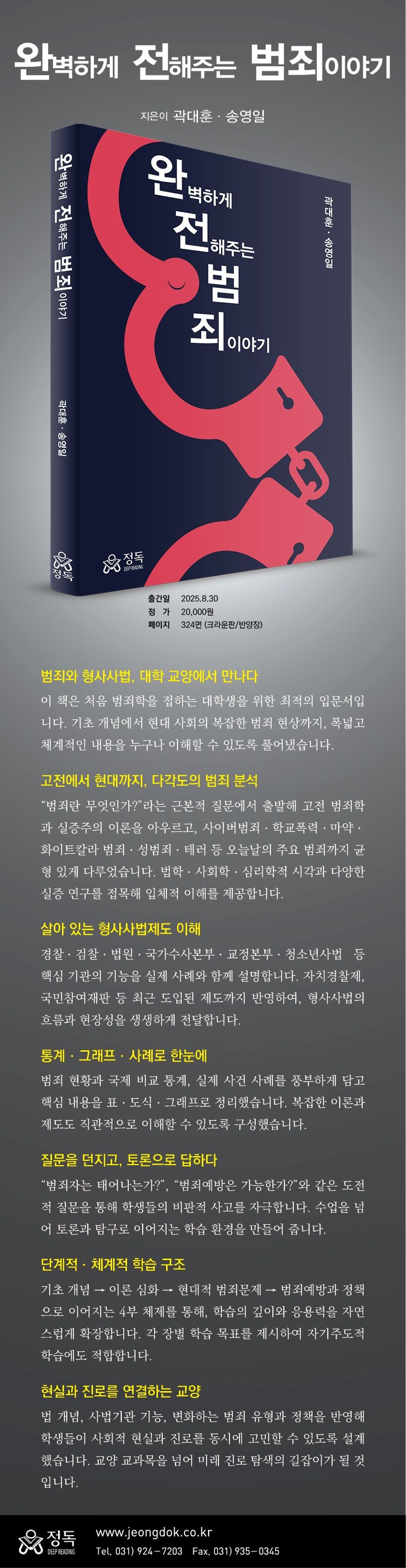 ‘범죄’라는단어는우리사회에서흔히두려움과불안을동반합니다.강력사건,조직범죄,사이버범죄와같은뉴스속이야기들은범죄를마치일상과는거리가먼,극단적이고이질적인현상으로인식하게만듭니다.하지만과연우리가알고있는범죄의모습은실제와얼마나일치할까요?범죄란정확히무엇이며,왜발생하는걸까요?그리고우리는그것에어떻게대응해야할까요?