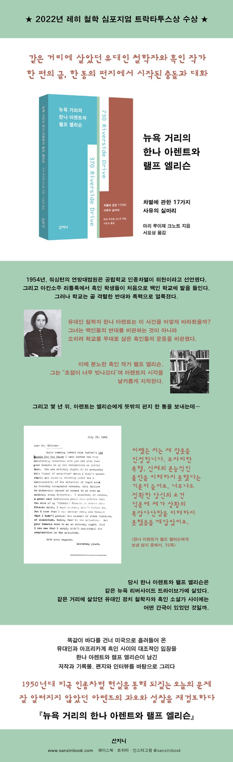 편지를 썼던 당시 한나 아렌트는 뉴욕 리버사이드 드라이브가 370번지에, 랠프 엘리슨은 730번지에 살았다. 같은 거리에 살았던 유대인 정치 철학자와 흑인 소설가 사이에는 어떤 간극이 있었던 것일까. 유대인으로서 차별을 경험했던 아렌트는 왜 흑인 학생들의 강제적 통합에 반대했으며 어떠한 이유로 추후에 그 생각을 바꾸었을까. 『뉴욕 거리의 한나 아렌트와 랠프 엘리슨』은 똑같이 바다를 건너 미국으로 흘러들어 온 유대인과 아프리카계 흑인 사이에 어떠한 대조적인 조건과 입장이 존재했는지 파고든다. 저자 마리 루이제 크노트는 한나 아렌트와 랠프 엘리슨이 남긴 저작과 기록물, 편지와 인터뷰를 바탕으로 번영과 발전으로 가득했던 20세기 중반 미국 사회의 어두운 단면을 그려내었다.