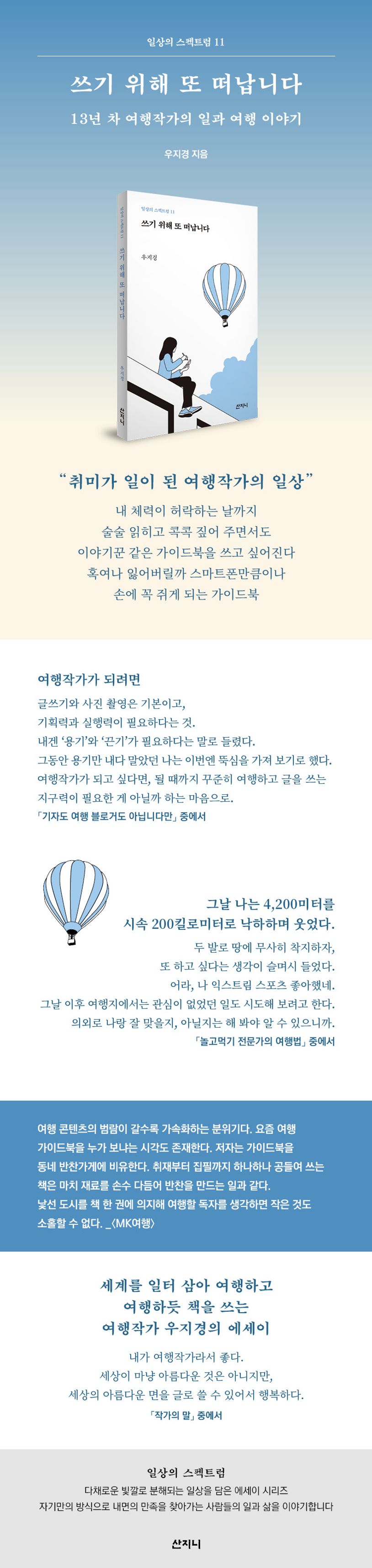 저자는 자신의 직업을 ‘세상의 아름다운 면을 글로 쓰는 일’이라고 말한다. 여행지에서는 예상치 못한 일들을 마주하게 되고, 이를 통해 세상을 바라보는 시선이 달라진다. 저자에게 아무리 일이라도 여행은 여행 그 자체로 즐겁다.