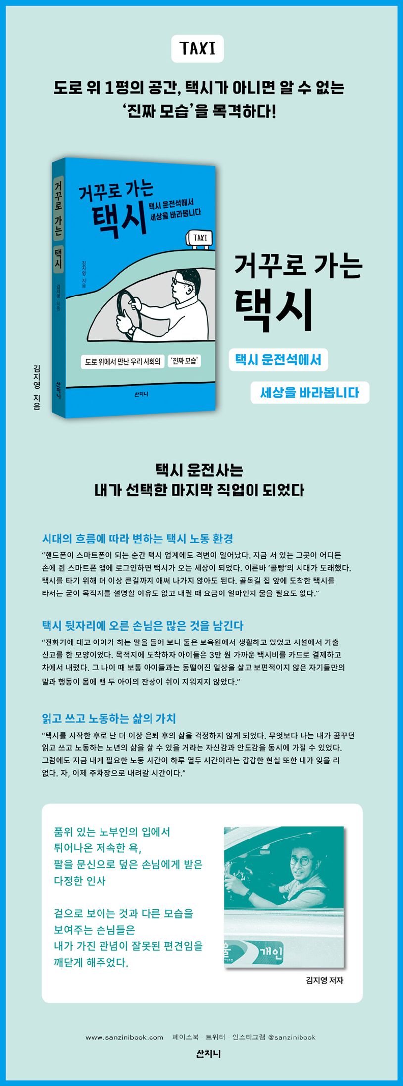 읽고 쓰고 노동하는 삶을 꿈꾸던 저자는 사회적 정년인 60세를 앞두고 택시를 운전하며 인생의 목표를 이루어나가고 있다. 『거꾸로 가는 택시』는 노년에도 일하는 삶을 꿈꾸는 평범한 택시 운전사의 삶을 통해 노동하는 삶의 가치를 전한다. 그리고 운전석에서 목격한 세상을 그만의 시선으로 바라보고 써 내려간 글은 택시 기사이기에 발견할 수 있었던 한국 사회의 민낯을 보여준다.