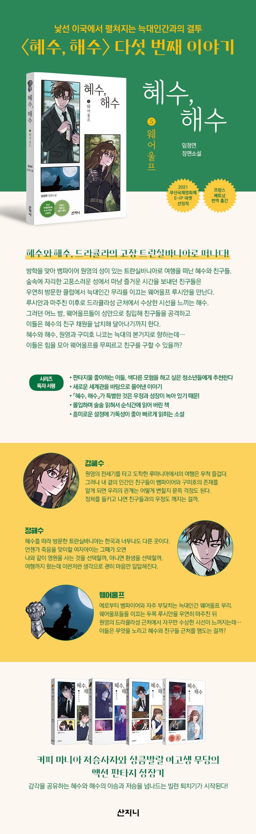 많은 청소년 독자로부터 사랑받은 소설 『혜수, 해수』 시리즈의 다섯 번째 이야기 『혜수, 해수 5-웨어울프』가 출간되었다. 무당 혜수와 베테랑 저승사자 해수가 이승과 저승을 넘나들며 빌런에 맞서 싸우는 이야기를 그린 시리즈 『혜수, 해수』. 새롭게 출간된 이야기에서는 방학을 맞아 해외여행을 떠난 혜수와 친구들이 맞닥뜨리는 다채로운 에피소드가 눈길을 끈다.