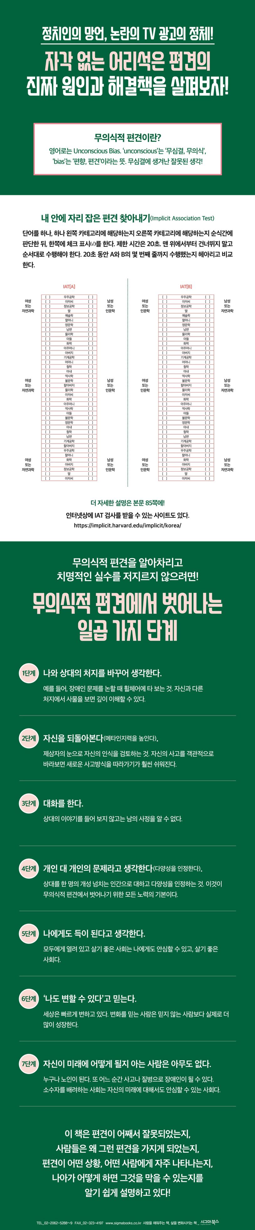 이 책은 우리 사회에 남아 있는 문제 있는 무의식적 편견과 앞으로 적극적으로 개선, 해결해야 하는 문제점들에 초점을 맞추고 있다. 심심찮게 사회 문제로 등장하고 있는 정치인의 망언, 성차별, 직장 내 괴롭힘, 갑질 등의 그 이면을 살펴보면 잘못된 사고방식이 고쳐지지 않고 편향, 즉 편견으로 자리 잡아 무의식중에 작용한다는 사실을 알 수 있다. 이러한 무의식적 편견을 하나씩 사례를 들며 살펴보고, 편견에서 벗어나는 방법에 관해서도 정리한다. 이 책으로 나를 지배하고 있는 무의식적 편견을 고찰해보자!