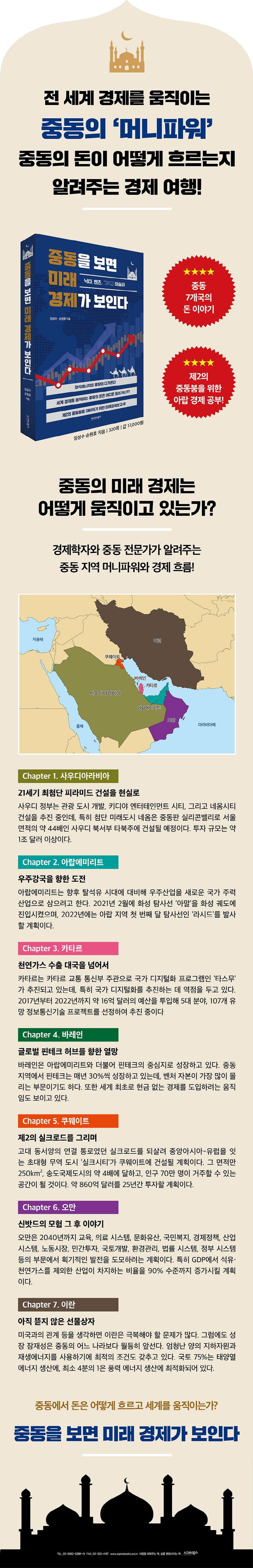 『중동을 보면 미래 경제가 보인다』는 알다가다 모를 곳, 중동 지역을 다룬다. 특히 중동 지역에서의 돈이 어떻게 흐르는지 이야기한다. 중동 주요 7개국인 사우디아라비아, 아랍에미리트, 카타르, 바레인, 쿠웨이트, 오만, 이란에서 어떻게 돈이 만들어지고, 어디를 향해 돈이 흘러가는지, 그리고 그 돈이 세계 경제에 어떤 영향을 미치는지 분석한다. 예나 지금이나 돈의 흐름을 읽는 것은 중요하다. 돈이 흐르는 곳에 기회가 있기 때문이다. 중동 경제 변화를 이해하는 것은 향후 세계 경제 변화 추세를 이해하는 중요한 단서이다. 더불어 이 책에서는 중동 지역에서 우리나라에게 어떤 사업 기회가 있는지 소개한다. ‘중동=석유’라는 인식의 오해와 편견을 바로잡고, 변화의 물결을 바라보는 길잡이를 제공할 것이다.