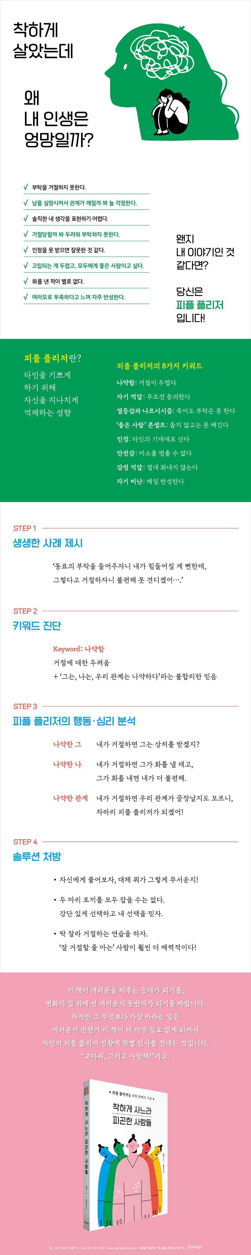 『착하게 사느라 피곤한 사람들』은 타인을 기쁘게 해야 한다는 강박에서 벗어나지 못하는 유형인 ‘피플 플리저’의 내면을 탐구하고, 피플 플리저가 현재의 고통을 극복하여 ‘진정한 나’로 살아갈 수 있도록 솔루션을 제시한 책이다.