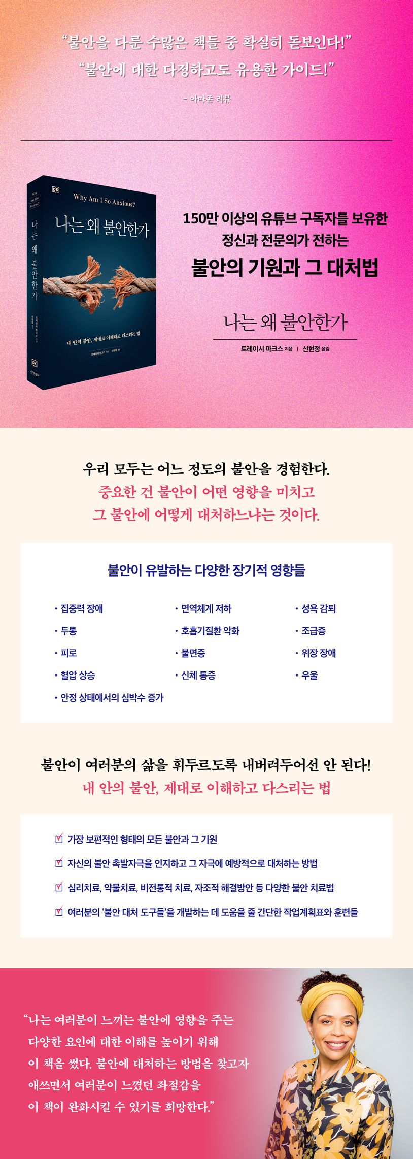 하지만 사실 그래야 할 이유는 전혀 없다. 가장 중요한 문제는 불안이 어떤 영향을 미치고 그 불안에 어떻게 대처하느냐는 것이다. 정신과 의사이자 유튜브 인플루언서인 트레이시 마크스 박사가 불안은 어떻게 그리고 왜 발생하는 것인지, 그리고 어떻게 정신건강을 보살펴서 삶의 제어력을 되찾을 수 있는지를 여러분이 이해하도록 도와줄 것이다.
