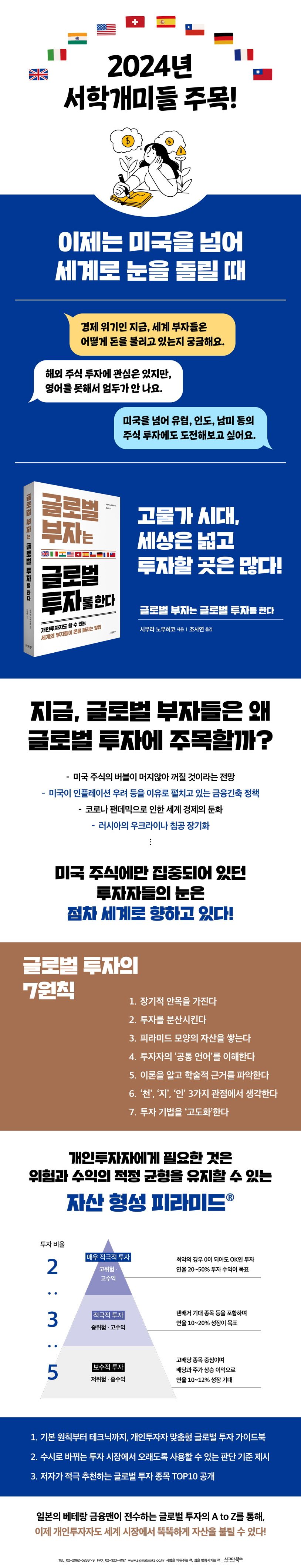 세계 경제에 인플레이션이 일어남에 따라 주식투자가 다시금 붐을 일으키고 있다. 이 가운데 세계의 부유층은 미국을 비롯해 전 세계 주식에 폭넓게 투자하는 방식인 ‘글로벌 투자’에 뛰어들고 있다. 이 책은 이렇게 글로벌 부자들이 주목하고 있는 글로벌 투자란 무엇인지에 대해 분석하고, 글로벌 투자를 할 때 지켜야 할 7가지 대원칙을 비롯해 앞으로 중요하게 생각되는 글로벌 종목은 무엇인지 등에 대해 기초부터 차근차근 해설한 책이다. 또 개인투자자들도 이러한 글로벌 투자를 따라 하다 보면 효율적으로 자산을 늘릴 수 있음을 강조하고 있다.