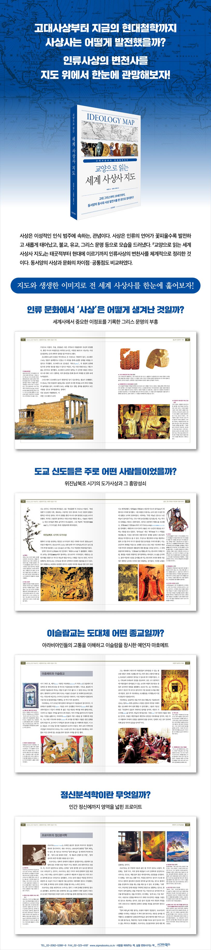 사상은 인간의 이성적인 인식 범주에 속하는 것이다. 이런 ‘사상’은 인류 역사에서 어떻게 시작되고 꽃피우고 지금에 이르렀을까? 언어도 제대로 갖춰지지 않은 시대에도 ‘사상’이란 게 있었을까? 사상이 있었기에 문명이 발전했을까, 아니면 문명이 있었기에 사상이 발전했을까? 『교양으로 읽는 세계 사상사 지도』는 고대부터 현대까지, 유대교, 불교, 유교, 그리스 문명, 중세 종교 이데올로기, 자본주의, 공산주의 등 인류사상의 변화를 한 권의 책, 한 페이지의 지도 위에 그려냈다. 이 책을 통해 동·서양의 사상과 문화의 차이점, 공통점 등을 한눈에 비교해볼 수 있을 것이다. 이 책의 지도를 따라가며 문명의 발전과 함께한 인간 사상의 변화를 느껴보기 바란다.
