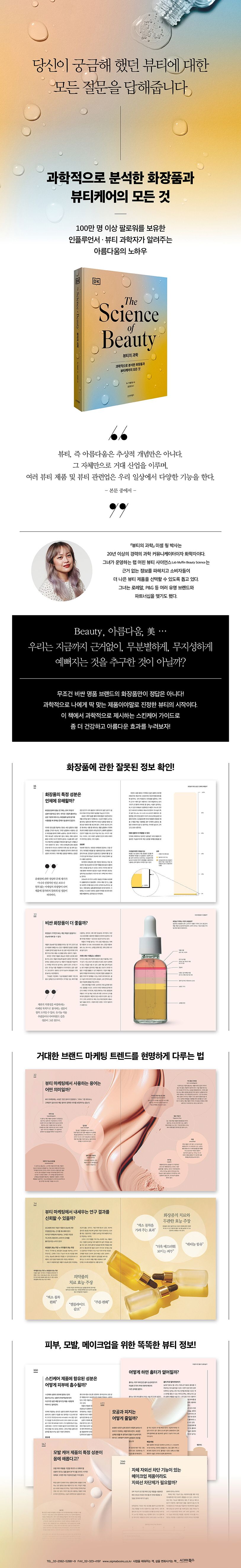 매일 쓰는 화장품, 과학적이고 스마트하게 내게 딱 맞는 제품일까? 이 책은 화장품과학 전문가의 오랜 연구와 경험을 바탕으로 만들어졌다. 『뷰티의 과학』은 기업의 마케팅 전략에 가려진 불편한 진실과 미용계의 잘못된 상식을 바로잡고, 각종 뷰티 제품의 올바른 사용법과 트렌드, 피부 및 모발 관리에 관한 100여 가지 질문에 확실한 해답을 제시한다. 그간 광고나 입소문에 의지해 제품을 구입하고, 실제 효능보다는 가격이나 브랜드를 신뢰했다면 ,이 책이 제안하는 스킨케어 루틴을 실천해보자. 더욱 저렴한 비용과 적은 노력으로도 젊고 아름다운 외모를 가꾸는 비결이 이 책에 담겨 있다!