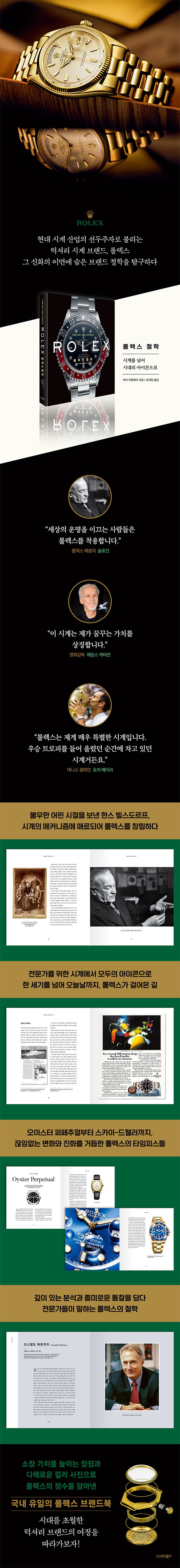 이 책은 롤렉스의 역사, 이미지, 전문가 분석, 미공개 인터뷰, 광고, 아카이브 자료를 통해 기업의 창립부터 오늘날까지의 여정을 이야기한 국내 유일의 롤렉스 브랜드북이다. 롤렉스 신화를 만든 혁신적인 기술과 특별한 디자인의 진화 과정을 따라가보자. 한 세기 넘게 이어지고 있는 성공의 근간이 된 진정성 있고 독창적인, 모방할 수 없는 철학을 발견할 수 있을 것이다.