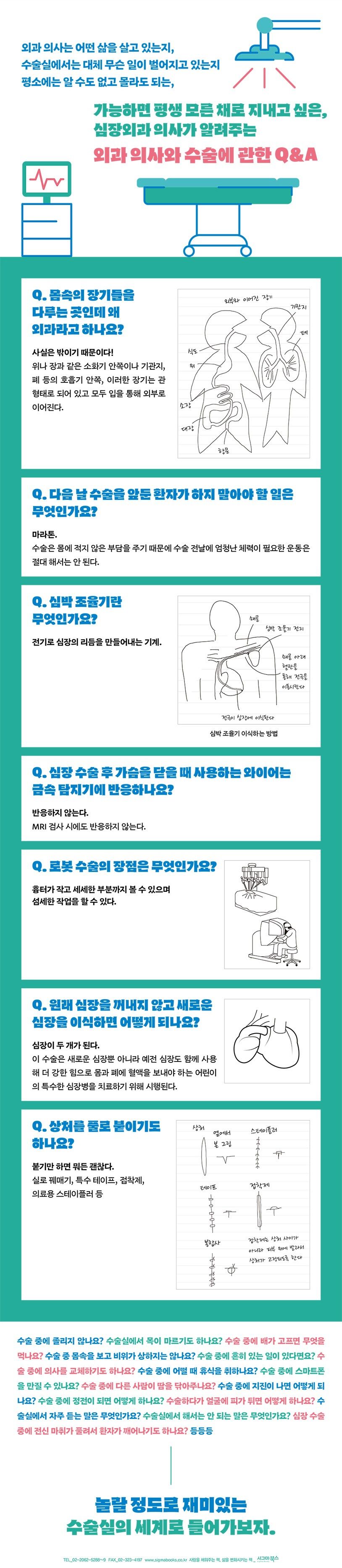 프롤로그제1장깜짝놀랄정도로재미있는수술실의세계001수술중에가장당황스러웠던일은무엇인가요?002몸속의장기들을다루는곳인데왜외과라고하나요?003빠르게끝내야하는수술은어떤수술인가요?004수술중에화장실에가고싶어지면어떻게하나요?005수술중에졸리지않나요?006수술실에서목이마르기도하나요?007수술중에배가고프면무엇을먹나요?008수술중몸속을보고비위가상하지는않나요?009수술중에흔히있는일이있다면요?010수술중에의사를교체하기도하나요?011수술중에어떨때휴식을취하나요?012수술중에스마트폰을만질수있나요?013수술중에다른사람이땀을닦아주나요?014수술중에지진이나면어떻게되나요?015수술중에정전이되면어떻게하나요?016수술하다가얼굴에피가튀면어떻게하나요?017수술실에서자주듣는말은무엇인가요?018수술실에서해서는안되는말은무엇인가요?019심장수술중에전신마취가풀려서환자가깨어나기도하나요?020수술전에이미지트레이닝을하기도하나요?021수술에는몇명정도가참여하나요?022왜두번째수술은힘든가요?023자신의가족을수술하기도하나요?024성공률1%인수술도있나요?025수술중적출한장기는어떻게하나요?026한밤중에도수술을하나요?027동시에두명의환자를수술하기도하나요?028술마시고있을때도긴급수술호출이오나요?029수술중에의료진들끼리대화를하나요?030수술중에어지러워서쓰러지는사람도있나요?031수술을유리창너머로견학할수있는방이있나요?032인간의신체를자를때냄새가나나요?033자신이수술을받는다면어디서받을건가요?034의사도수술을받을때긴장하나요?035의사는자기몸도수술할수있나요?036다음날수술을앞둔환자가하지말아야할일은무엇인가요?037수술할때문제가발생하기쉬운몸은어떤몸인가요?038수술에레지던트가들어오지못하도록요청해도되나요?039전신마취중에코를고는사람도있나요?040수술전에환자가질문을많이하면싫어하나요?041수술전에어떻게손을씻나요?042외과의사가양손을드는포즈를하는이유는무엇인가요?043수술복은매번세탁하나요?044외과의사는손을자주씻어야해서손이거칠어지지않나요?045환자의혈액형에따라수술의난이도가달라지나요?106의료도구:포셉이란?107의료도구:유구포셉이란?108의료도구:니들홀더란?109의료도구:봉합사란?110의료도구:메스란?111의료도구:메첸바움이란?112의료도구:쿠퍼란?113의료도구:페안지혈겸자란?114의료도구:켈리겸자란?115의료도구:토니켓이란?116의료도구:거즈란?117의료도구:마스크란?118의료도구:드레인이란?119의료도구:흡인관이란?제2장절대말할수없는병원과의사의비밀126우수한의사인지아닌지구분하는방법이있나요?127의사라도받고싶지않은검사는무엇인가요?128사용하면전문가처럼보이는의학용어에는무엇이있나요?129의사와환자가사랑에빠지기도하나요?130만나고싶지않은환자는어떤사람인가요?131자신이나가족의연명치료를할생각인가요?132의사가뇌물을받기도하나요?133의사도이성의나체를보고흥분하나요?134의사가된후가장감동한순간이있다면요?135의사의직업병은무엇인가요?136시한부선고를한적이있나요?137병원에서귀신을본적이있나요?138진짜외과의사는병원에고용되어일하고있나요?139대학병원과일반병원의업무에차이가있나요?140병원내에이상한습관이나규칙이있나요?141의사에게간호사는어떤존재인가요?142간호사에게괴롭힘을당한적이있나요?143의사는간호사에게인기가많나요?144핑크병원이무엇인가요?145머리가나빠도의사가될수있나요?146의대에입학하기위해서는무엇이필요한가요?147의대에서어떤시험이가장어려웠나요?148의사국가고시에합격하기위해필요한것은무엇인가요?149베테랑간호사와전공의의사이가불편해지기도하나요?150의사가된이유는무엇인가요?제3장생명과인체의신비183몸안은무슨색인가요?184늙지도죽지도않는삶은가능할까요?185심장병은유전되나요?186심장에털이난사람이정말로있나요?187심장이터지기도하나요?188심장에도암이생기나요?189심장에도근육통이생기나요?190심장을만졌을때어떤감촉이드나요?191심장주변에주머니가있다던데요?192롤러코스터를타면왜심장이붕뜨는느낌이나나요?193심장박동은왜왼쪽에서더강하게느껴지나요?194심장은평생동안몇번정도뛰나요?195긴장하면왜심장이두근거릴까요?196맥박은어떻게확인할수있나요?197하품은왜날까요?198가장필요없는장기는무엇인가요?199사랑에빠졌을때왜심장이쿵쾅거릴까요?200추울때이가덜덜떨리는이유는무엇인가요?201배꼽을청소하면배가아픈이유는무엇인가요?202왜배에서소리가나나요?203닭살은왜돋나요?204야한생각을하면코피가나나요?205혈관의굵기는어느정도인가요?206뼈에도피가흐르나요?207뛰면왜옆구리가아플까요?208인간의침은더럽나요?209딸꾹질이나는이유는무엇인가요?210배를찔렸는데입에서피가나오기도하나요?제4장미국의진짜외과의사226미국에서수술할때는영어로하나요?227미국과일본의수술실은무슨차이가있나요?228미국의사들의급여는어느정도인가요?229문신을해도병원에서일할수있나요?230수술중에잘전달되지않는영어는무엇인가요?231미국에서일하려면무엇이필요할까요?232미국병원에서총을들고위협하는사람이있