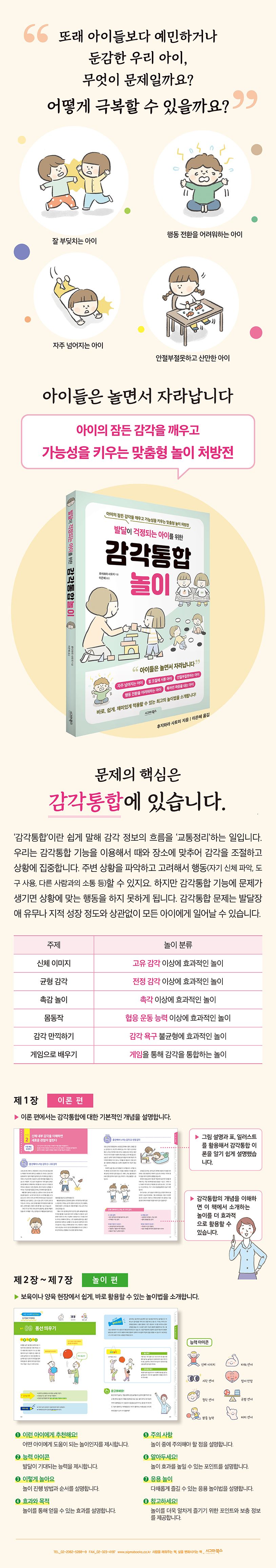 이 책은 자주 넘어지고, 힘 조절이 서툴고, 안절부절못하고, 툭하면 짜증을 내는 등 발달이 걱정되는 아이의 행동 수수께끼를 ‘감각통합’이라는 관점에서 해석한 놀이 안내서이다. 1장 ‘이론 편’에서는 감각통합에 관한 이론을 알기 쉽게 설명했으며, 2~7장 ‘놀이 편’에서는 현장에서 바로, 쉽게, 재미있게 실천하며 아이의 감각을 자극할 수 있는 100가지 이상의 놀이법을 담았다.