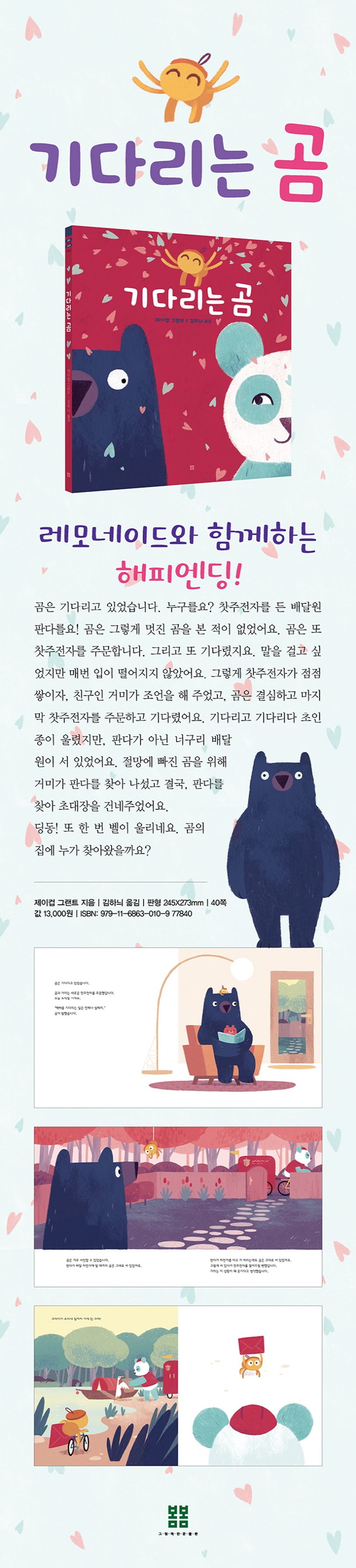 누군가를 기다리는 설렘과 약간의 긴장을 아시나요? 오늘은 볼 수 있을까? 오늘은 말을 걸어 볼까? 곰이 배달원 판다를 볼 수 있는 유일한 방법은 찻주전자를 주문하고 기다리는 것이었습니다. 곰이 용기를 낸 것과 판다를 만나 즐거운 시간을 보낼 수 있게 된 것은 친구인 거미의 응원과 도움 덕분입니다. 거미와 곰의 우정이 서로를 움직이게 했습니다.