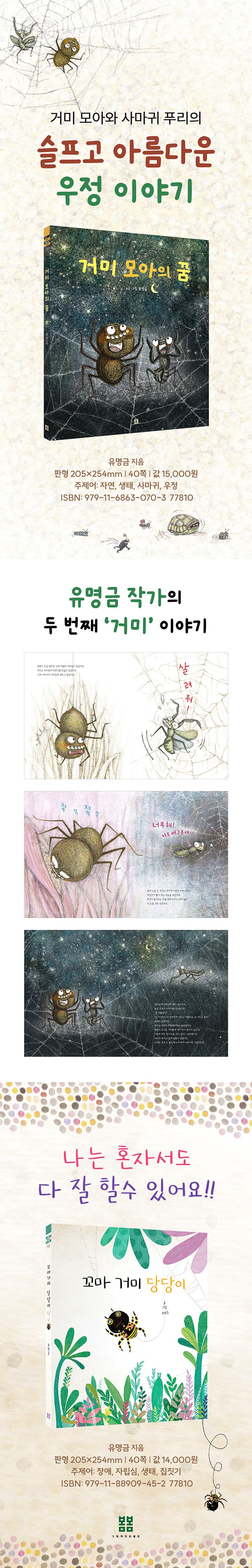 그러던 어느 날 밤, 아무것도 먹지 못한 푸리는 배가 너무나도 고픈데, 모아가 구석에서 무언가를 빨아 먹고 있었어요. 그 다음 날에도 둘은 하루 종일 깔깔 웃으며 춤추고 놀았습니다. 그리고 밤이 되면 또 다시 푸리는 배고픔에 잠들지 못하다가 잠든 모아의 다리 하나를 몰래 뜯어 먹게 됩니다. 둘의 우정은 어떻게 되는 걸까요? 유명금 작가의 두 번째 ‘거미’ 이야기입니다.