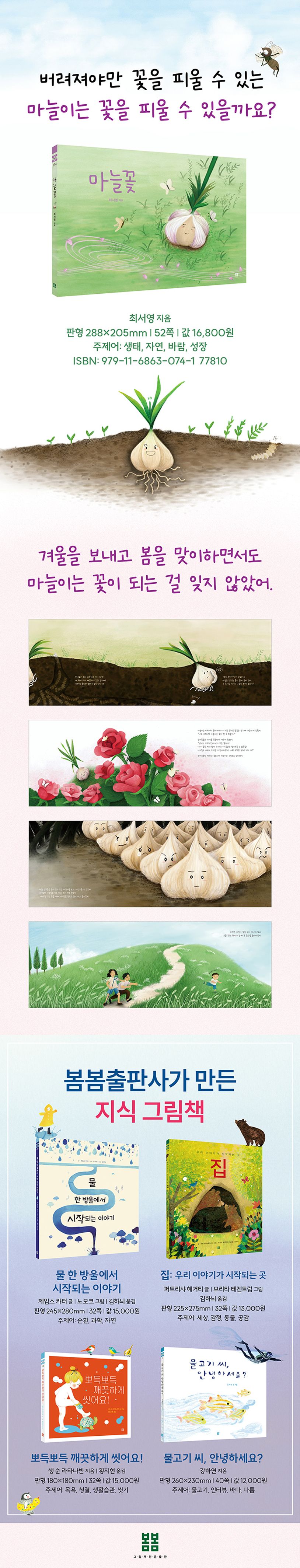 하지만 마늘이는 행복합니다. 마늘이는 누군가에게 인정받기보다 다만 바람과 함께 춤을 추고 싶었을 뿐이니까요. 최서영 작가는 2년간 직접 ‘마늘’을 키워 꽃을 피워내고 관찰하면서 책을 만들었습니다. 누군가에게 인정받지 못해 서러운 생각이 들 때, 마늘이를 떠올려 달라고 말합니다. 마늘이처럼 자신의 고유한 꿈을 갖고 살아가기를 바란다고요.