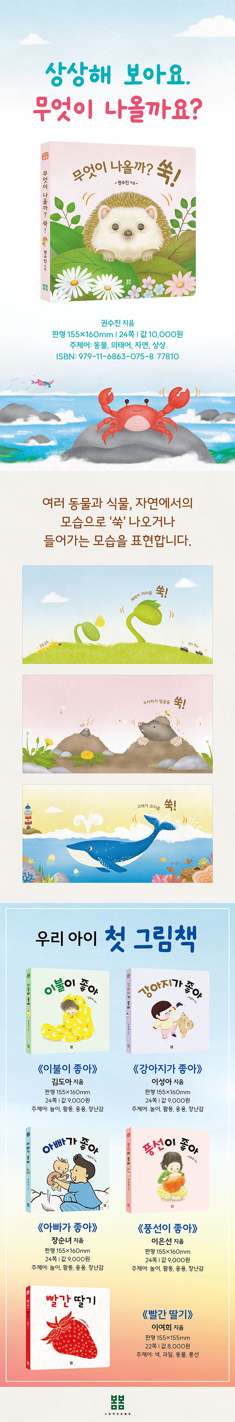 고양이 다리가 쑥! 하고 나옵니다. 새싹이 머리를 쑥! 하고 내밀지요. 고래가 꼬리를 쑥! 하고 내밀고, 꽃게가 집게발을 쑥! 하고 들어 올렸더니, 해님도 고개를 쑥! 하고 내밀어 인사합니다.
