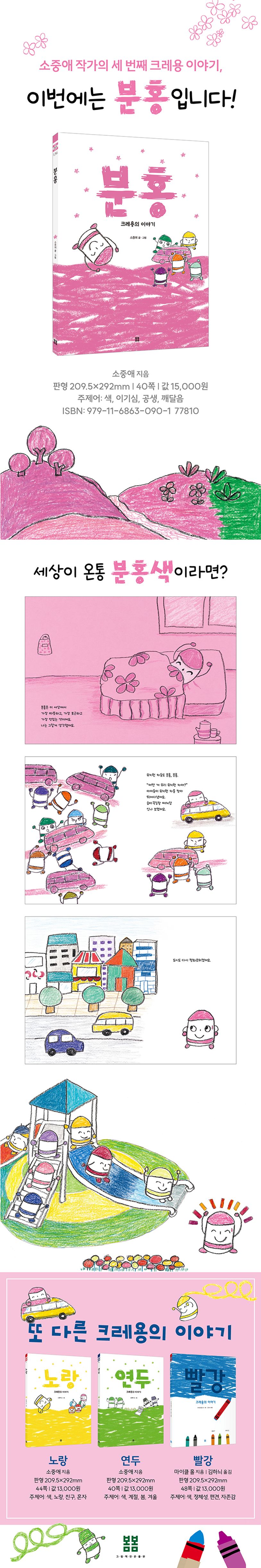 분홍 크레용은 분홍색이 이 세상에서 가장 따뜻하고, 가장 포근하고, 가장 멋있는 색이라고 생각했어요. 그래서 세상이 온통 분홍색이 되면 좋겠다고 생각했지요. 우리 동네부터 분홍색으로 칠합니다. 분홍, 분홍! 유치원 차들도 분홍, 분홍! 신호등도 분홍, 분홍! 다른 아이들은 집이 어디인지, 어느 유치원 차가 자기네 차인지 헤매고, 도로는 빵빵 소리로 혼잡했지만, 분홍이는 모두가 행복해한다고 생각했어요. 그렇게 혼자만의 생각으로 들판까지도 모두 분홍으로 칠하고 있을 때, 해님이 소리쳤어요. 처음에 분홍이는 해님도 분홍색이 되고 싶어한다고 생각했지요. 분홍이는 해님을 향해 올라갔는데, 어, 어, 어…. 몸이 흐느적흐느적 이상해져요. 분홍이는 어떻게 되는 걸까요? 세상은 계속 분홍색이 될 수 있었을까요?