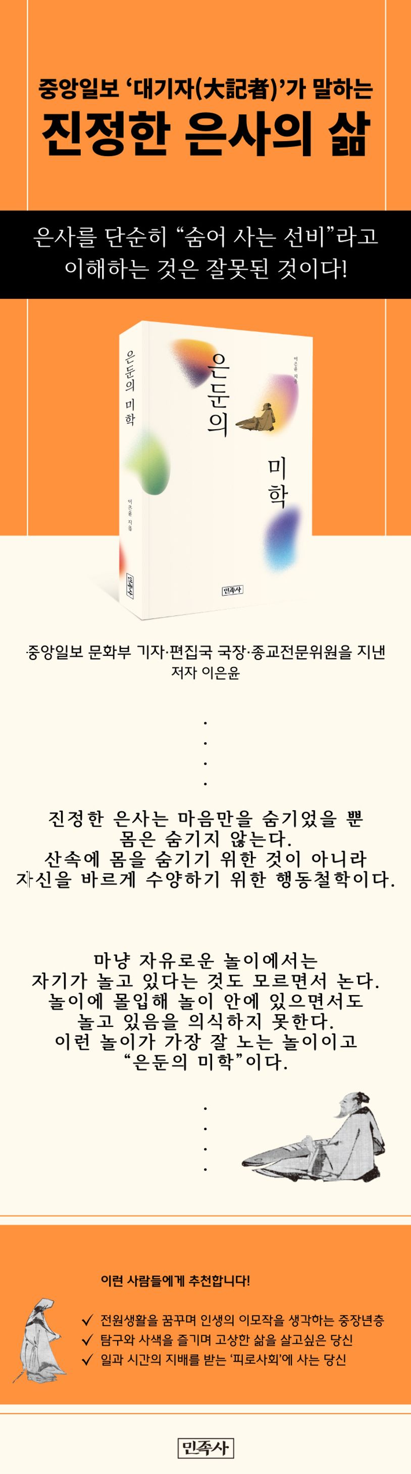 〈은둔의 미학〉은 중앙일보 종교담당 대기자로 유명한 이은윤 선생이 코로나로 시골에 칩거할 수밖에 없었던 시기에 고향 집에 내려가 자연과 벗하면서 고전을 읽고, 농사를 짓는 전원생활에서 저자의 사색, 사유세계를 건져 올린 현대판 은사(隱士)의 고품격 에세이집이다.